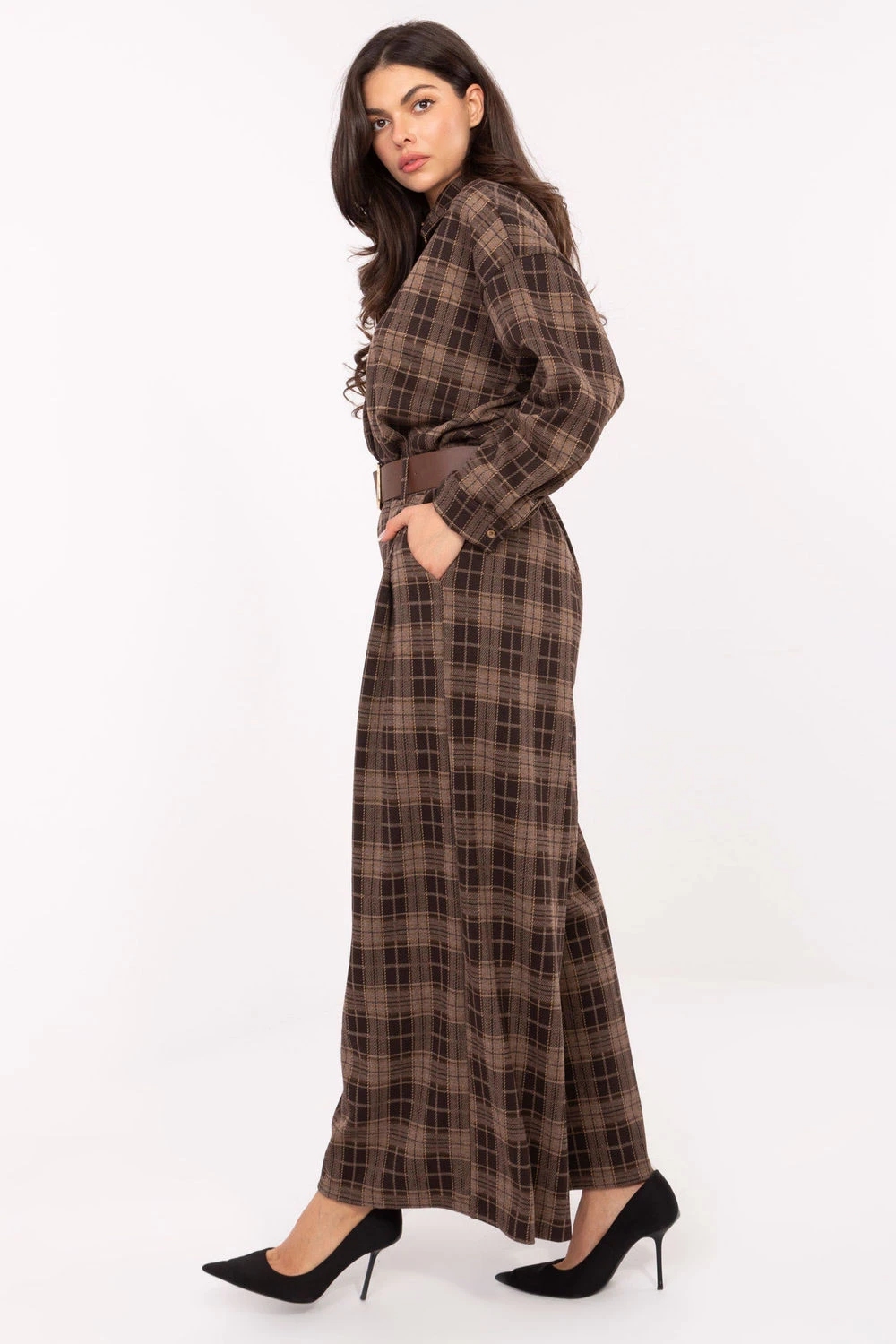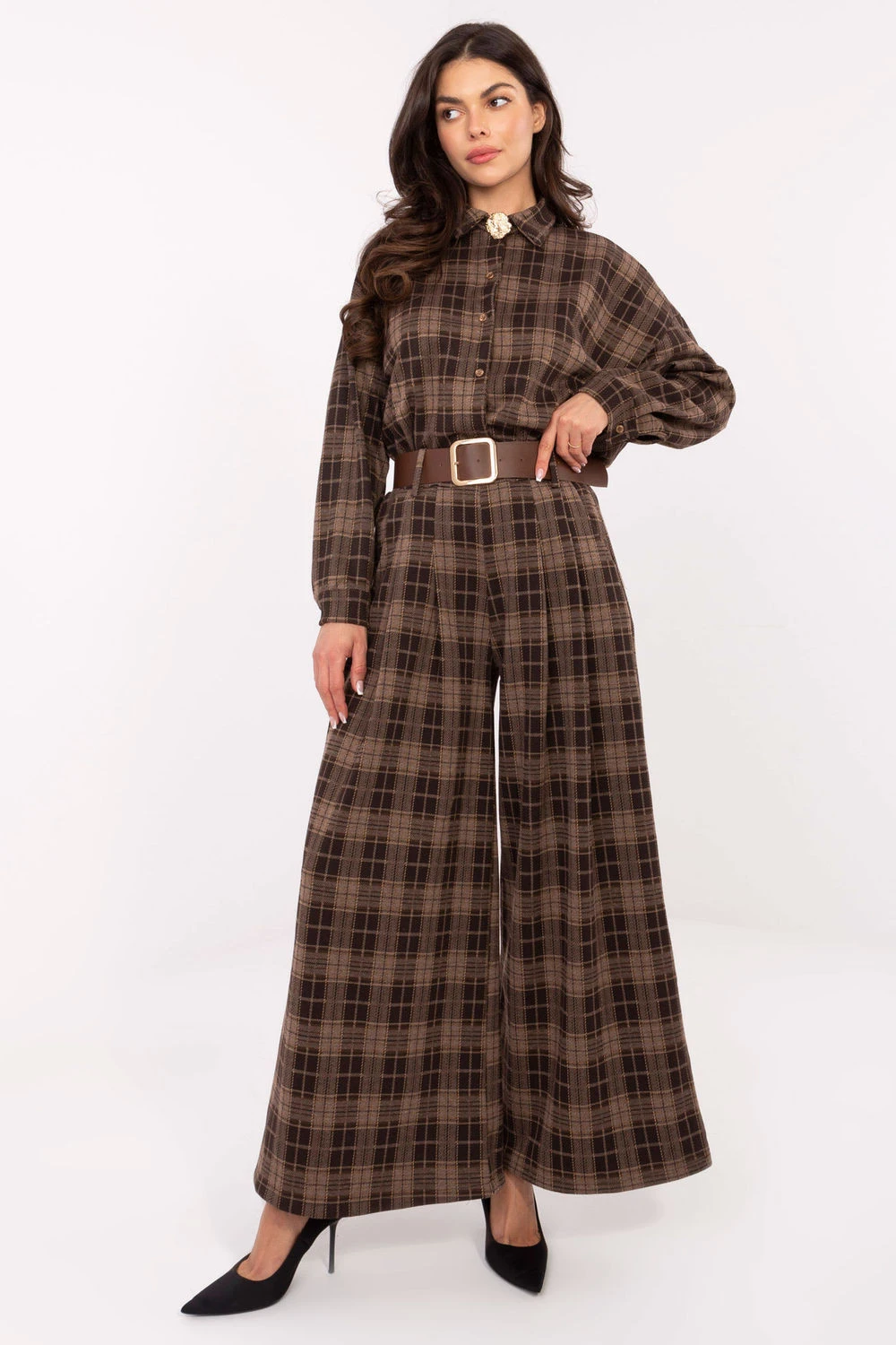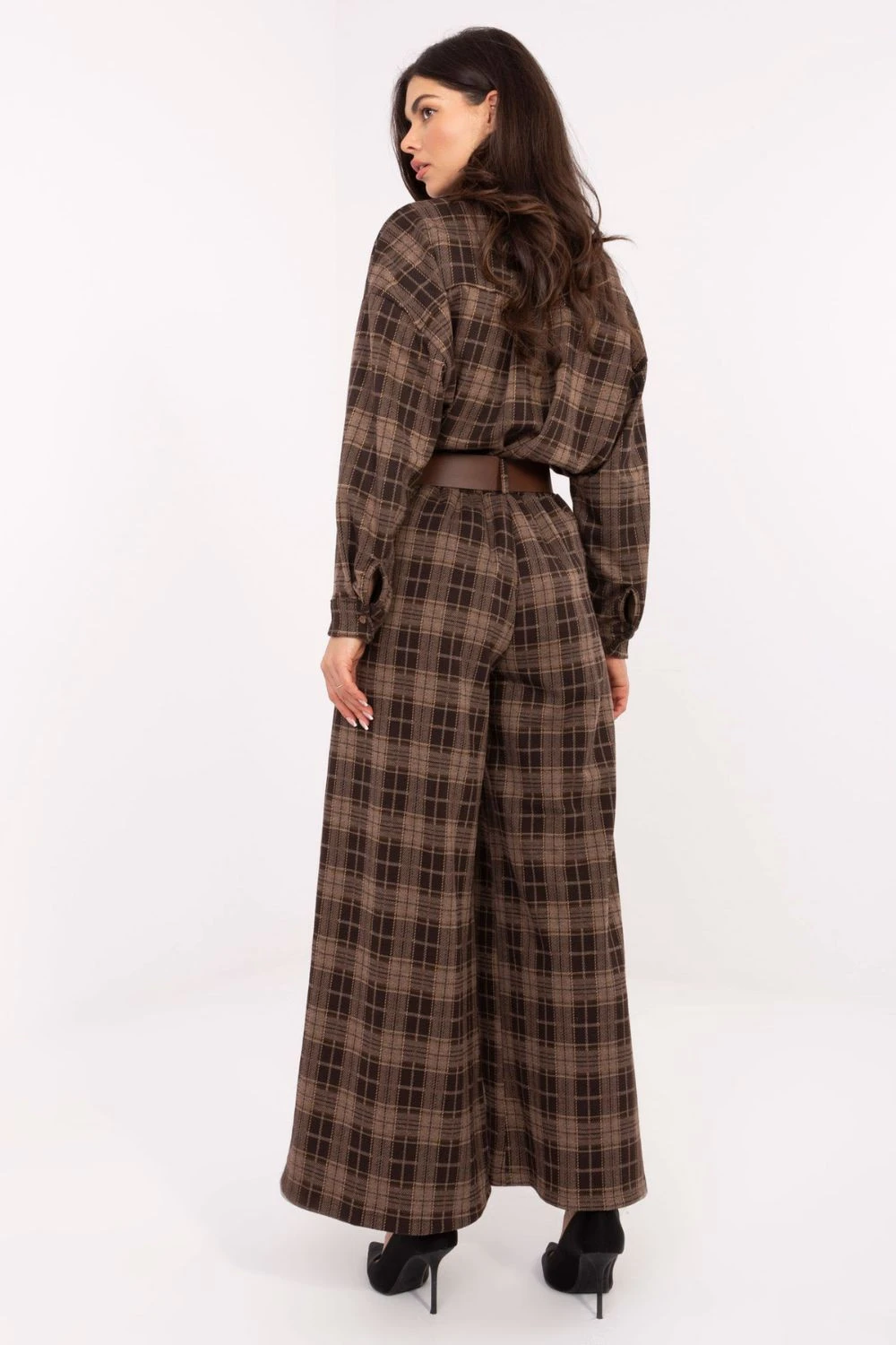 Moderní a pohodlné dámské flanelové kalhoty typu palazzo s casual charakterem, ideální pro každodenní styling. Vyrobené z vysoce kvalitní směsi polyesteru, viskózy a elastanu, poskytují pohodlí, lehkost a jemnou pružnost, díky čemuž se skvěle přizpůsobují postavě. Model má vysoký pas a široké nohavice typu palazzo, které opticky prodlužují nohy a dodávají postavě lehkost. Boční kapsy a zapínací pásek přidávají praktičnost a umožňují zdůraznit pas. Kalhoty mají kostkovaný vzor, který přináší klasický, nadčasový akcent, a absence zapínání zajišťuje, že jsou mimořádně pohodlné a snadno použitelné. Jedná se o univerzální model, který se skvěle hodí jak do každodenních, casual stylizací, tak do více elegantních setů do práce.