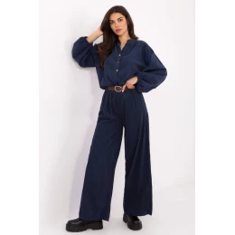 Elegatní sametové kalhoty v casual stylu, ideální na každý den. Vyrobené z měkkého materiálu s vysokým obsahem polyesteru, poskytují pohodlí a pohodlí po celý den. Model má vysoký pas s vsazenou gumou v pase, která zaručuje perfektní přizpůsobení siluetě a pohodlí při pohybu. Široké nohavice typu wide leg dávají kalhotám moderní, lehce retro charakter, a vložené boční kapsy jim dodávají praktičnost. Celkový vzhled doplňuje zapínací pás, který zdůrazňuje pas a dokončuje stylový vzhled. Tyto materiálové kalhoty jsou skvělou volbou pro ženy, které ocení volnost a elegantní minimalismus ve svých každodenních stylizacích.
