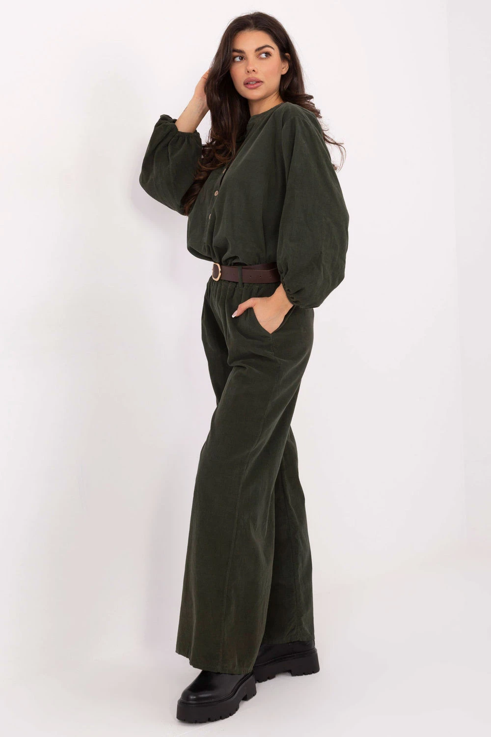 Stylové štručkové kalhoty v casualovém stylu, ideální na každý den. Vyrobené z měkkého materiálu s vysokým obsahem polyesteru, zajistí pohodlí a pohodlí po celý den. Model má vysoký pas s všitou gumou v pase, která zaručuje ideální přizpůsobení postavě a pohodlí při pohybu. Široké nohavice typu wide leg dodávají kalhotám moderní, lehce retro charakter, a vkládané boční kapsy jim dodávají praktičnost. Celkový vzhled doplňuje zapínací pásek, který zdůrazňuje pas a dokončuje stylový vzhled. Tyto látkové kalhoty jsou skvělou volbou pro ženy, které ocení volnost a elegantní minimalismus v každodenních stylových kombinacích.