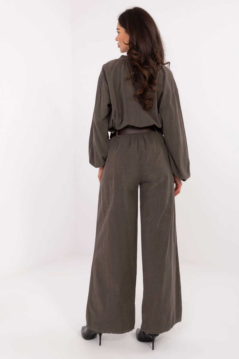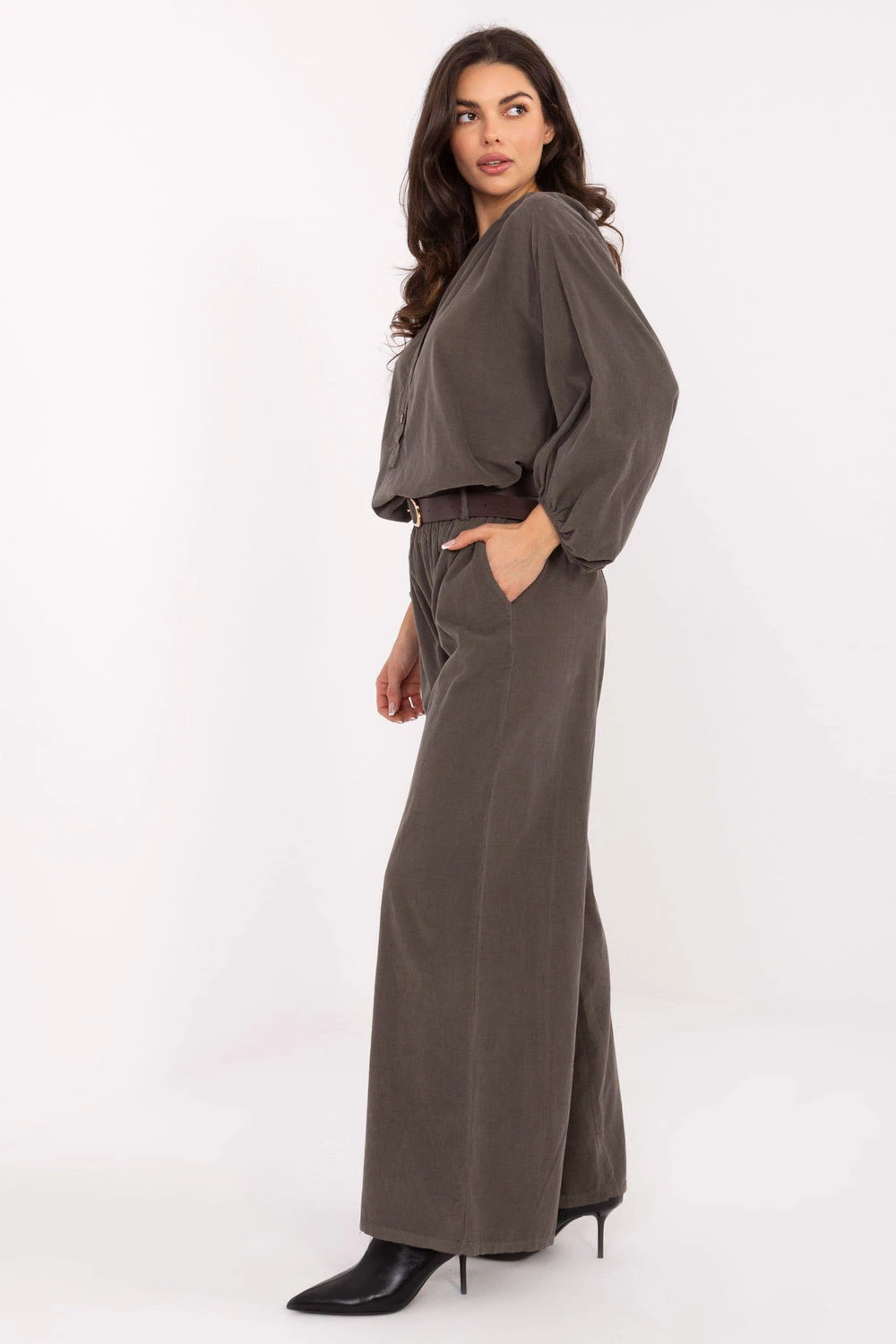 Stylové návleky na kord v casual stylu, ideální na každý den. Vyrobeno z měkkého materiálu s vysokým obsahem polyesteru, zajistí pohodlí a pohodlí po celý den. Model má vysoký pas s gumou na pasu, která zaručuje ideální přizpůsobení postavě a pohodlí při pohybu. Široké nohavice typu wide leg dodávají kalhotám moderní, lehce retro charakter, a boční kapsy s vložením přidávají praktičnost. Celkový vzhled doplňuje zapínací pás, zdůrazňující pas a dokončující stylový vzhled. Tyto materiálové kalhoty jsou skvělou volbou pro ženy, které ocení volnost a elegantní minimalismus ve svých každodenních outfitách.