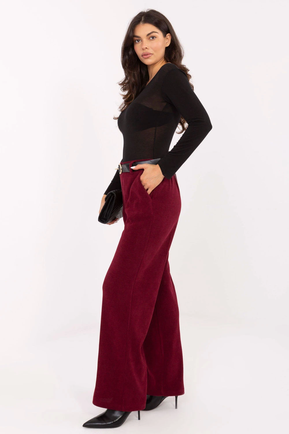 Sametové dámské kalhoty s širokými nohavicemi jsou kombinací elegance a pohodlí v moderním provedení. Vyrobené z měkkého materiálu s různorodou strukturou sametu, s příměsí polyesteru a elastanu, zajišťují pohodlí nošení a skvělé přizpůsobení postavě. Vysoký pas krásně zdůrazňuje pas, zatímco široké nohavice dodávají kalhotám moderní, volný charakter. V zadní části je vsazena elastická guma pro ideální přizpůsobení, zatímco vložené boční kapsy zvyšují funkčnost modelu. Další výhodou je zapínací pásek, který celkově doplňuje a umožňuje stylové dokončení outfitu. Ideální na každý den a do práce, skvěle ladí jak s elegantní košilí, tak s volným svetrem.