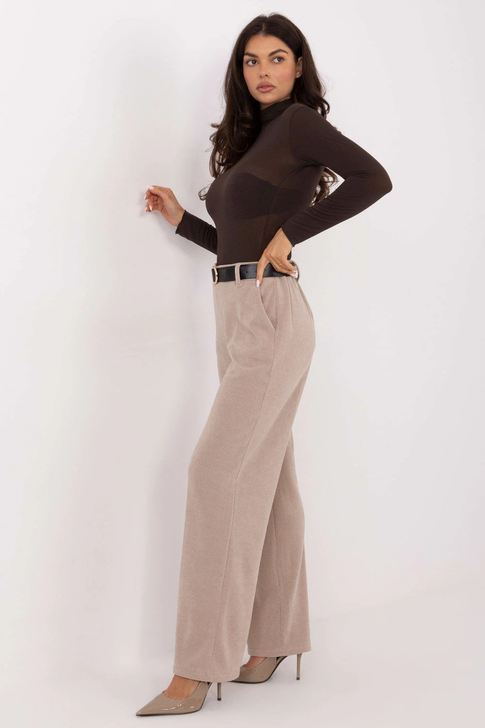 Flanelové dámské kalhoty s širokými nohavicemi jsou spojením elegance a pohodlí v moderním provedení. Vyrobené z měkkého materiálu s různorodou fakturou flanelu, s příměsí polyesteru a elastanu, poskytují pohodlí nošení a skvělé přizpůsobení postavě. Vysoký pas krásně zdůrazňuje pas, a široké nohavice dodávají kalhotám moderní, uvolněný charakter. V zadní části je vsazena elastická guma, která zaručuje ideální přizpůsobení, zatímco vložené boční kapsy zvyšují funkčnost modelu. Další výhodou je zapínací pásek, který celkový vzhled dokresluje a umožňuje stylové dokončení outfitu. Ideální na každý den a do práce, skvěle ladí jak s elegantní košilí, tak s volným svetrem.