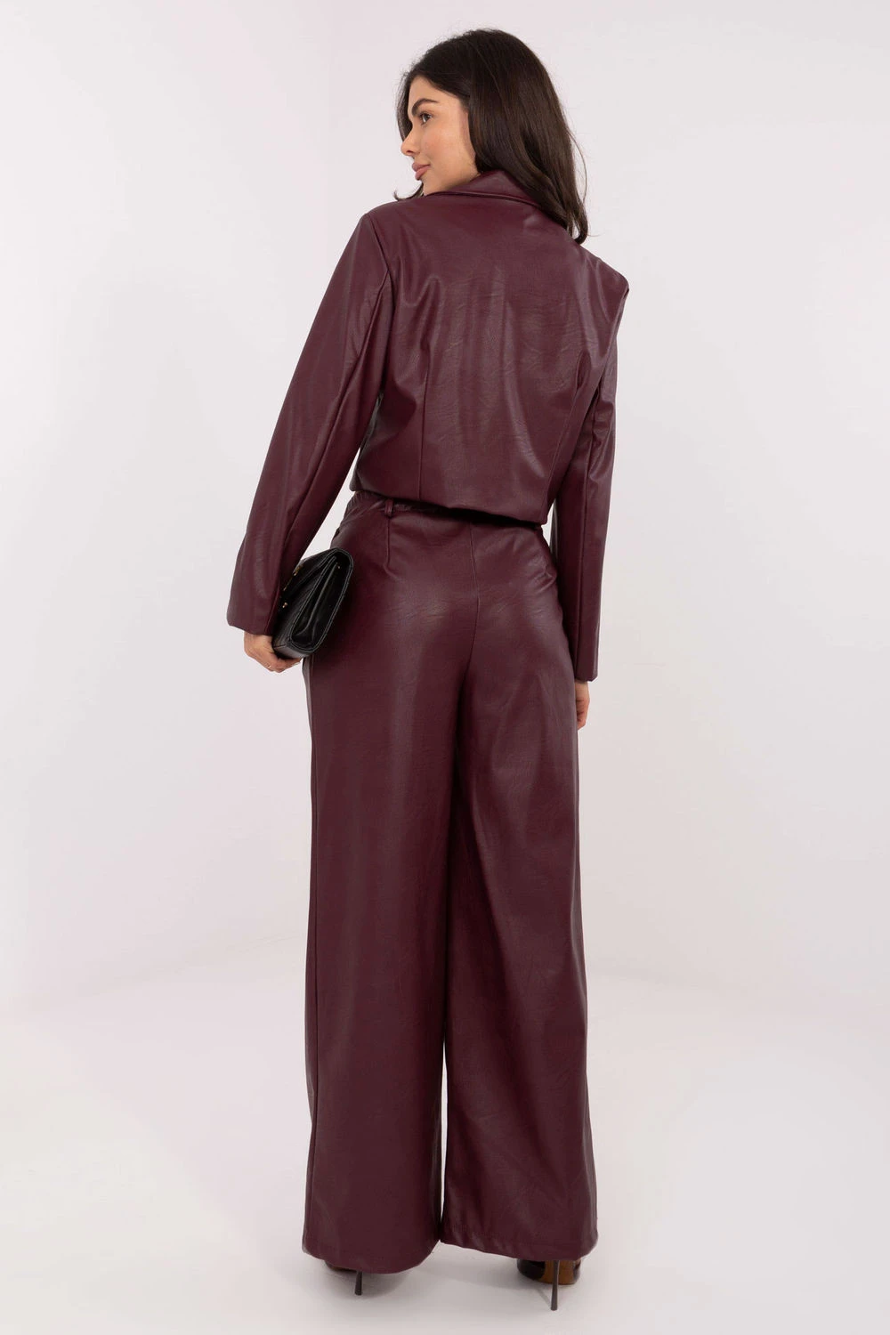 Moderní a stylové dámské kalhoty z ekokože, které skvěle kombinují módní vzhled s pohodlím nošení. Vyrobené z vysoce kvalitního polyuretanu na bázi polyesteru, vyznačují se hladkým povrchem a elegantním leskem, který dodá každému outfitu jedinečný charakter. Model s vysokým pasem a širokými nohavicemi (wide leg) krásně zdůrazňuje pas a prodlužuje siluetu. Kalhoty mají zapínání na zip a knoflíky a boční kapsy, které jim dodávají funkčnost. Díky jemnému podšívání jsou ideální na chladnější dny, poskytují tepelný komfort a stylový vzhled po celý den. Jsou skvělou volbou pro každodenní casual outfit, který se vyznačuje módním dokončením a nadčasovým charakterem.