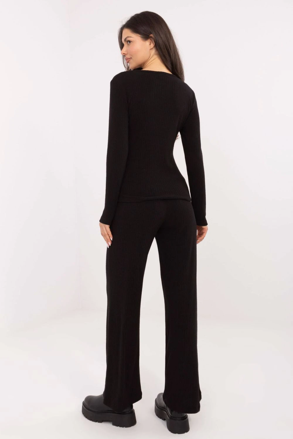 Pohodlné dámské kalhoty z pleteniny ve stylu casual jsou ideální volbou pro každodenní příležitosti, kdy je důležitý pohodlný a moderní vzhled. Jejich hladký, minimalistický vzor se skvěle hodí k mnoha stylizacím, od sportovních po elegantnější. Model je vyroben z příjemné směsi: viskózy, nylonu a polyesteru, co zajišťuje elasticitu, odolnost a vysoký komfort nošení. Vysoký pas zdůrazňuje pas a opticky prodlužuje postavu, zatímco široké nohavice dodávají kalhotám moderní, lehce volný charakter. V pase je šňrování, které umožňuje perfektní přizpůsobení obvodu, a boční kapsy přidávají praktičnost. Celkový dojem dotváří proužkovaná struktura materiálu, která zdůrazňuje moderní, stylový vzhled. Jsou to kalhoty, které se skvěle hodí jak doma, tak mimo něj - jsou měkké, pohodlné a vždy módní.