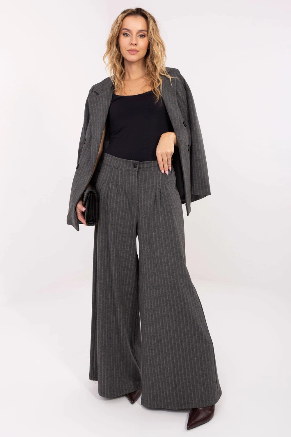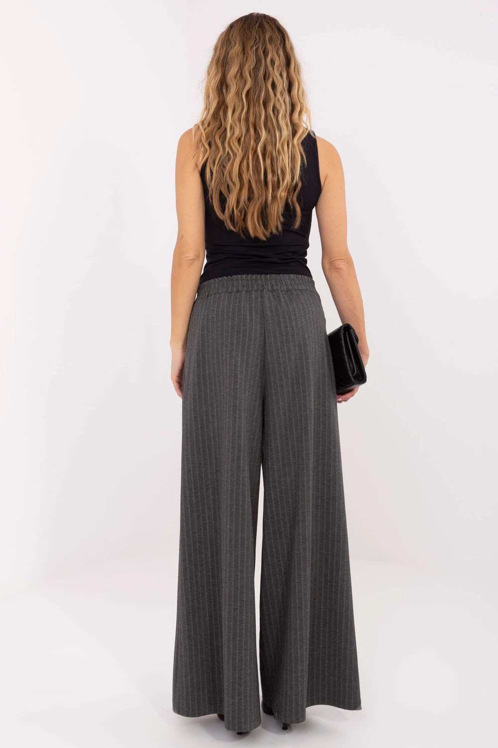 Elegantní dámské látkové kalhoty typu palazzo jsou skvělou volbou na každý den, do práce a na společenské události, kdy je důležitý šarm a moderní forma. Jejich decentní pruhovaný vzor opticky zúží postavu a zároveň dodává kalhotám elegantní, klasický charakter. Model je vyroben z vysoce kvalitní směsi nylonu, viskózy, elastanu a polyesteru, díky čemuž jsou kalhoty lehké, prodyšné, elastické a pohodlné na nošení. Vysoký pas krásně zdůrazňuje pas, zatímco široké nohavice typu palazzo dodávají celku volný a zároveň velmi elegantní střih. V horní části přední strany jsou ozdobné záložky, které kalhotám dodávají výjimečný charakter a decentně zdůrazňují elegantní styl. Praktické zapínání na zip a knoflík zajišťuje pohodlí a stabilní přizpůsobení. Jsou to kalhoty, které spojují nadčasový styl s moderním střihem, ideální pro ženy, které oceňují eleganci, pohodlí a rafinované detaily.