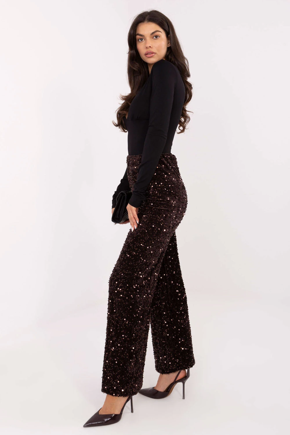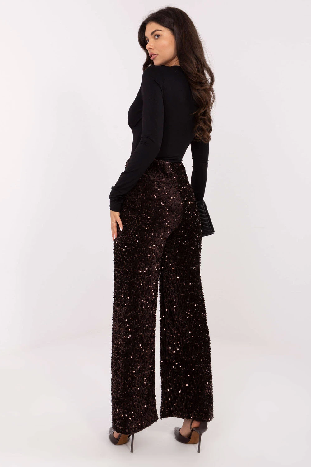 Elegantní látkové kalhoty s flitry, navržené na výjimečné příležitosti, jako jsou společenské události a večírky. Vyrobené z kombinace polyesteru a elastanu, kalhoty zajistí pohodlné padnutí a jemný lesk díky aplikaci flitrů, která jim dodává výraznosti. Model s rovnými nohavicemi a vysokým pasem jemně prodlužuje postavu. Bez zapínání a kapes dodává celkovému vzhledu hladký, minimalistický vzhled, a jemná podšívka zajišťuje pohodlí nošení. Tyto kalhoty jsou ideální volbou, pokud chcete outfitu přidat elegantní, efektní akcent.