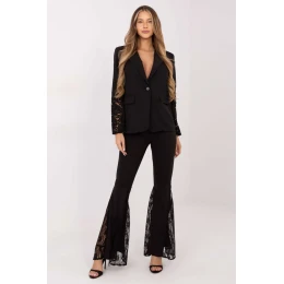 Elegantní dámské zvonové kalhoty jsou stylovým návrhem určeným pro návštěvy a večerní události, kde se počítá s elegancí, moderním střihem a ženským charakterem. Model vyrobený z polyesteru, viskózy a elastanu poskytuje pohodlí, pružnost a ideální přizpůsobení postavě, zatímco si udržuje elegantní vzhled. Hladký dominantní vzor zajišťuje minimalistický a nadčasový vzhled kalhot. Střih s vysokým pasem krásně zdůrazňuje pas, zatímco široké zvonové nohavice prodlužují nohy a dodávají celku efektní, ženský charakter. Model nemá zapínání a skvěle se přizpůsobuje postavě, zajišťující vysoký komfort nošení. Pro lehký, decentní dekorativní prvek byly po stranách na spodní části nohavic umístěny krajkové vložky, které kalhotám dodávají eleganci a jedinečné dokončení. Model nemá kapsy, což umocňuje jejich hladký, návštěvní charakter. Jsou to ideální kalhoty pro ženy, které chtějí vypadat stylově, s elegancí a ženskou jemností, skvělé na slavnostní události, recepce a speciální večerní výstupy.