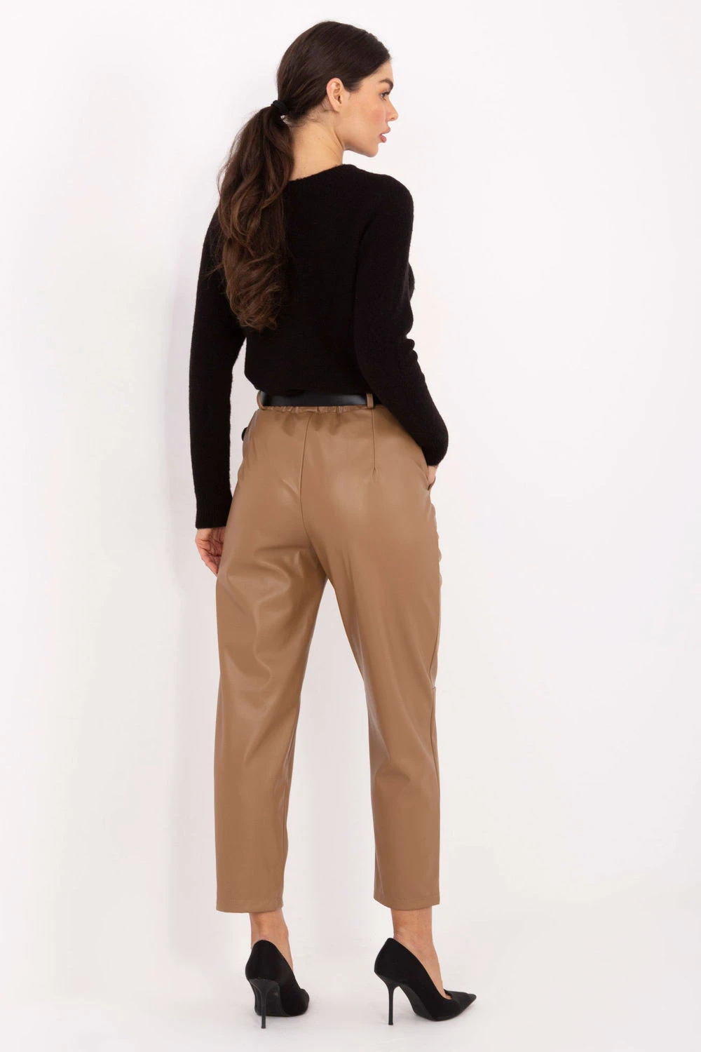 Stylové a pohodlné dámské kalhoty z ekokůže jsou ideální volbou pro ženy, které ocení spojení elegance a pohodlí. Model bez zapínání s nasazeným elastickým pásem vzadu skvěle padne a usnadňuje oblékání. Vysoký pas jemně zdůrazňuje pas, a zúžené nohavice dodávají celku moderní, ženský charakter. Kalhoty jsou vyrobeny z měkké ekokůže (kombinace polyesteru + polyuretanu), co zaručuje trvanlivost, pohodlí a efektní vzhled. Boční kapsy s vložkou přidávají funkčnost a zapínací pásek umožňuje individuální přizpůsobení v pase. Díky podšívce s izolací se kalhoty hodí i na chladnější dny. Jejich hladký vzor a volný styl je činí skvělou volbou jak do práce, tak na každý den.