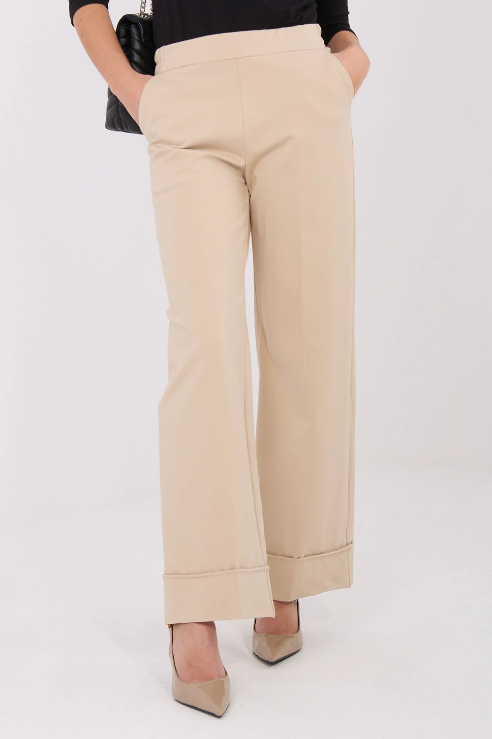 Stylové a pohodlné dámské kalhoty s širokými nohavicemi, ideální na každý den i do práce. Vyrobené z směsi viskózy, nylonu a elastanu, jsou měkké, prodyšné a pružné, díky čemuž poskytují pohodlí po celý den. Dominantní hladký vzor jim dodává univerzální a nadčasový charakter. Kalhoty mají vysoký pas, který krásně zdůrazňuje pas. Na zadní straně pasu je vsazena elastická guma, která zajišťuje ideální přizpůsobení a pohodlí nošení bez nutnosti použití zapínání, model je zcela bez zapínání. U spodní části nohavic je široký ohrnutý lem, který přidává módní a uvolněný akcent. Široké nohavice a lem dodávají kalhotám elegantní dokončení, zatímco zachovávají volný charakter. Funkční boční kapsy zvyšují praktičnost modelu.