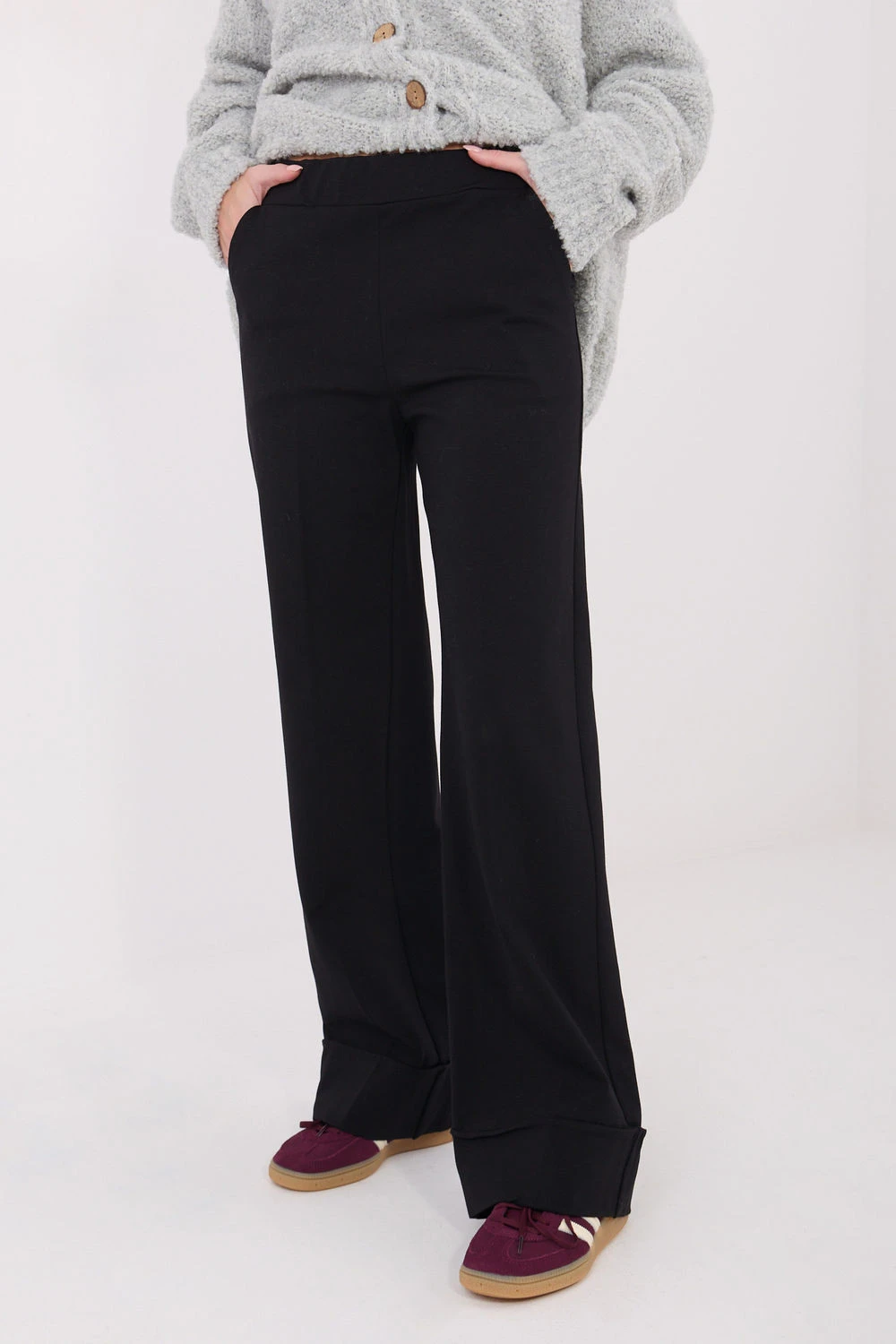 Stylové a pohodlné dámské kalhoty s širokými nohavicemi, ideální na každý den i do práce. Vyrobené z směsi viskózy, nylonu a elastanu jsou měkké, prodyšné a pružné, což zajišťuje pohodlí po celý den. Dominantní hladký vzor jim dodává univerzální a nadčasový charakter. Kalhoty mají vysoký pas, který krásně zdůrazňuje pas. Na zadní straně pasu je vsazena elastická guma, která zajišťuje ideální přizpůsobení a pohodlí nošení bez nutnosti použití zapínání, model je úplně bez zapínání. Na spodku nohavic je široký obrázek, který přidává módní a uvolněný akcent. Široké nohavice a lem dodávají kalhotám elegantní dokončení, zároveň zachovávají neformální charakter. Funkční boční kapsy zvyšují praktičnost modelu.