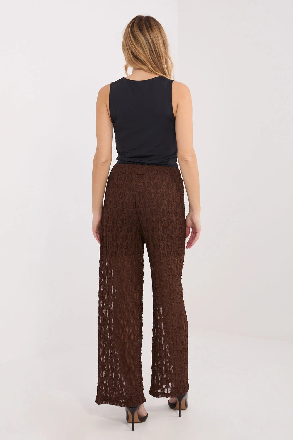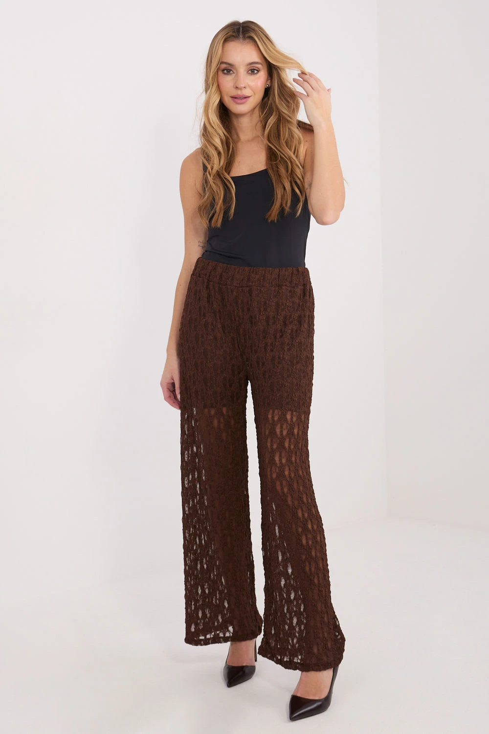 Elegantní krajkové kalhoty typu wide leg pro ženy jsou stylovým návrhem, který se skvěle hodí jak na každodenní nošení, tak i na slavnostní události nebo večírky. Model spojuje pohodlí nošení s výjimečným ženským designem. Kalhoty jsou vyrobeny z kombinace viskózy a elastanu, co zajišťuje měkkost, pružnost a pohodlné přizpůsobení se postavě. Různorodá struktura materiálu dodává celku elegantní charakter a zdůrazňuje dekorativní styl krajky. Vysoký pas a elastický pásek krásně zdůrazňují pas a zaručují pohodlí po celý den. Široké nohavice ve stylu wide leg opticky prodlužují nohy a dodávají postavě lehkost. Model bez zapínání, který se obléká přes boky, je praktický a pohodlný na nošení. Podšívka v horní části zajišťuje adekvátní krytí a pohodlí nošení, aniž by narušovala jemný vzhled materiálu. Jedná se o skvělou volbu pro ženy, které chtějí spojit eleganci s moderním střihem a pohodlím.