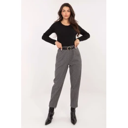Elegantní dámské cygaretkové kalhoty jsou skvělou volbou na každý den i do práce. Vyrobené z vysoce kvalitního polyesteru, kombinují odolnost s estetickým vzhledem a pohodlím nošení. Klasický vzor v jodełce jim dodává nadčasový elegantní charakter, který se skvěle hodí do kancelářských i volnočasových outfitů. Model s vysokým pasem krásně zdůrazňuje pas a poskytuje pohodlí po celý den. Zúžené nohavice opticky zúží postavu, dodávají jí lehkost a harmonické proporce. Kalhoty nemají tradiční zapínání, ale v pasu je vsazena elastická guma, která zajistí ideální přizpůsobení. Bočně umístěné kapsy zvyšují funkčnost, zatímco zapínací pás je praktickým a stylovým doplňkem, který dokonale doplní celkový elegantní vzhled.