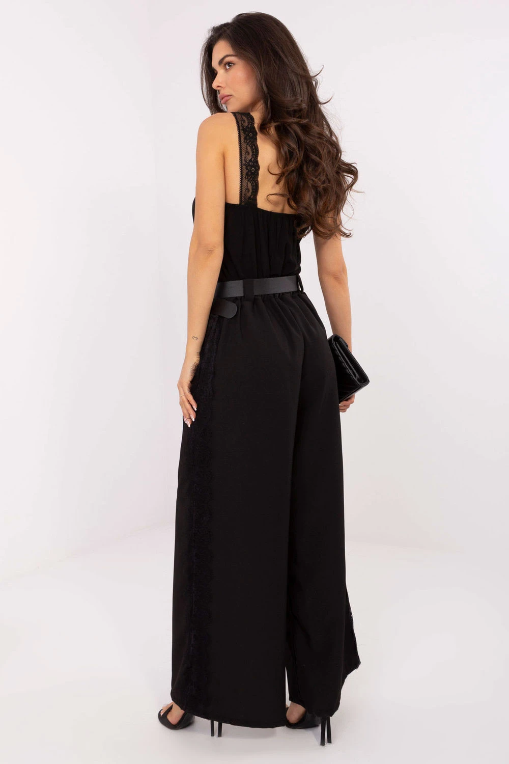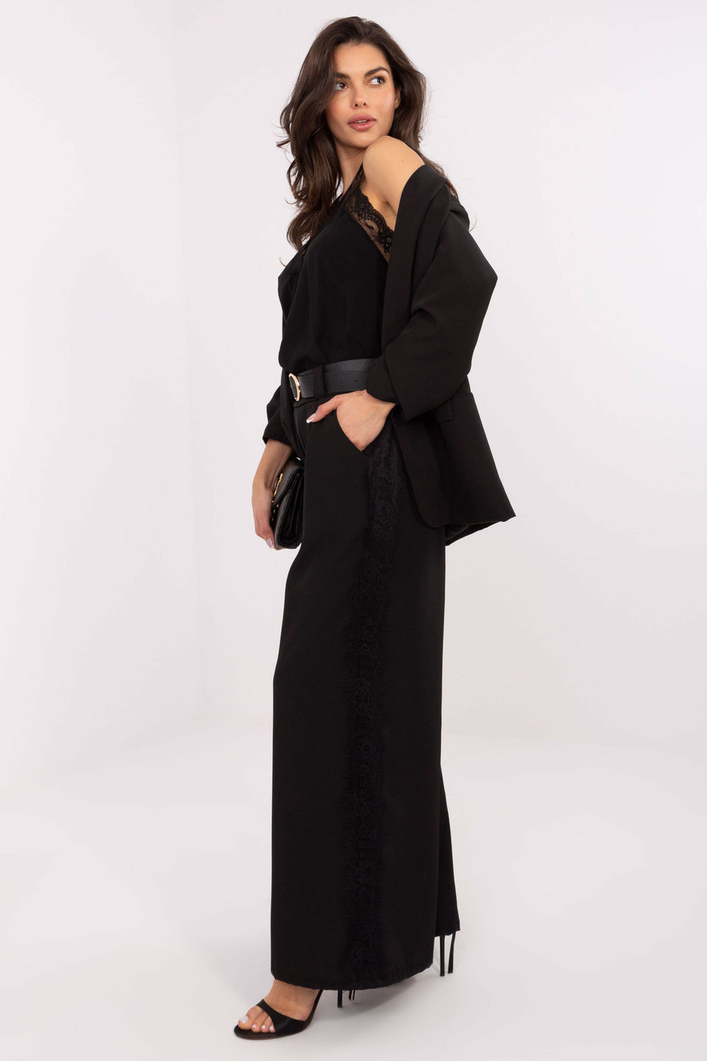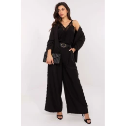 Elegantní dámské látkové kalhoty jsou spojením pohodlí a stylového vzhledu, ideální pro každodenní outfit a do práce. Model s hladkým vzorem umožňuje snadné kombinování s různými vrchními díly oblečení, vytvářející jak neformální, tak elegantní outfit. Kalhoty mají vysoký pas s všitou gumou, co zajišťuje pohodlí a perfektní přizpůsobení se postavě. Široké nohavice zaručují pohodlí nošení, a boční kapsy dodávají praktičnost. Navíc je model vybaven zapínacím páskem a decentní krajkou ušitou podél nohavic, co dává kalhotám unikátní ženský charakter. Vyrobené z vysoce kvalitní směsi viskózy a elastanu, kalhoty jsou měkké, elastické a odolné, zajišťující pohodlí po celý den. Ideální volba pro ženy, které ocení eleganci spojenou s pohodlím a originálními detaily.