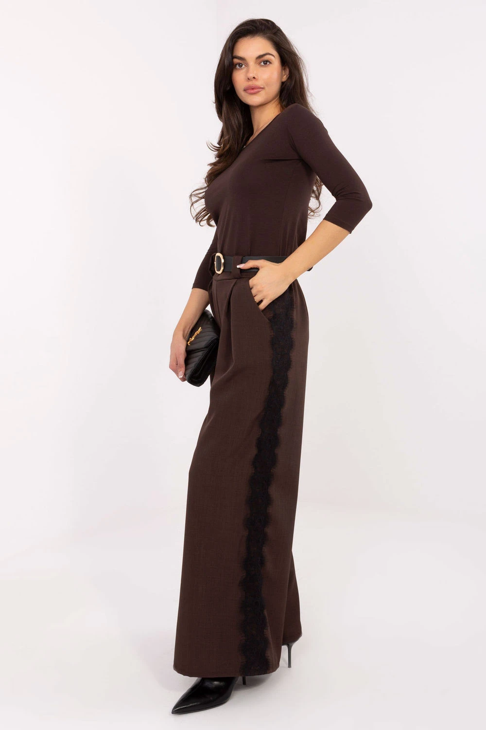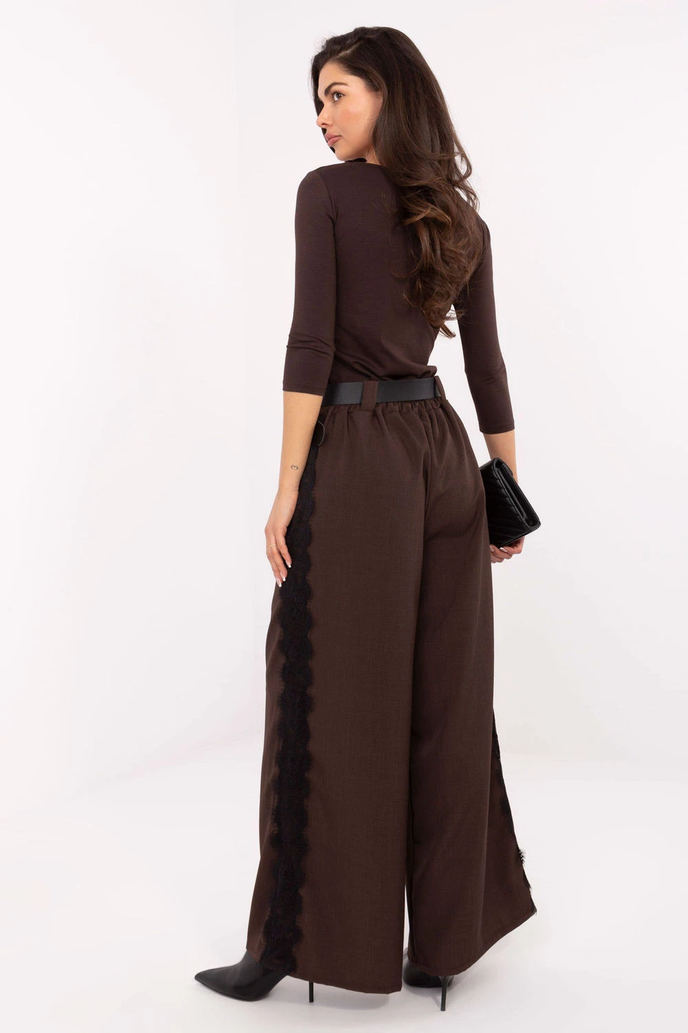 Elegantní dámské látkové kalhoty jsou kombinací pohodlí a stylového vzhledu, ideální pro každodenní outfit a do práce. Model s hladkým vzorem umožňuje snadné kombinování kalhot s různými vrchními kousky oblečení, vytvářející jak ležérní, tak elegantní outfit. Kalhoty mají vysoký pas s vsazenou gumou, co zajišťuje pohodlí a ideální přizpůsobení se postavě. Široké nohavice zaručují pohodlí při nošení a boční, vsunuté kapsy přidávají praktičnost. Navíc je model vybaven zapínacím páskem a decentní krajkou přišitou podél nohavic, co dává kalhotám jedinečný ženský charakter. Vyrobené z vysoce kvalitní směsi viskózy a elastanu, kalhoty jsou měkké, elastické a odolné, poskytující pohodlí po celý den. Ideální volba pro ženy, které ocení eleganci spojenou s pohodlím a originálními detaily.