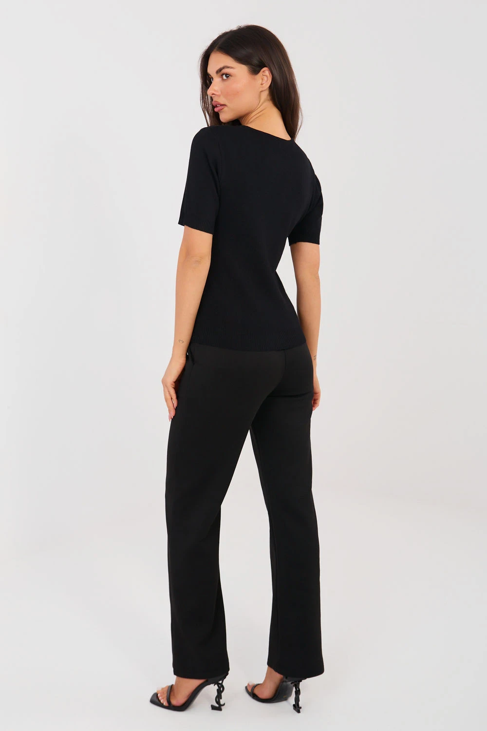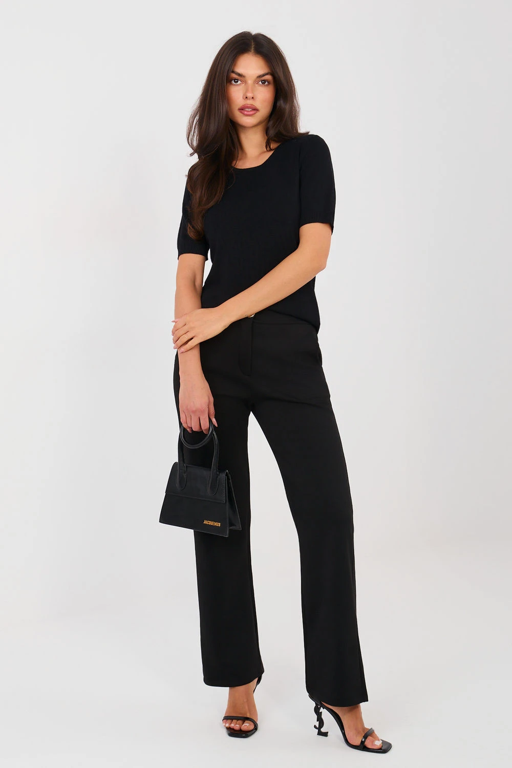Elegantní dámské kalhoty typu straight leg z materiálu, které nejenom okouzlují svým vzhledem, ale také pohodlím nošení. Vyrobené z velmi příjemného materiálu typu měkké máslo, jemného a hladkého, poskytují luxusní pocit na kůži po celý den. Model s vysokým pasem krásně zdůrazňuje pas a opticky prodlužuje siluetu, zatímco rovné nohavice dodávají celku nadčasový, elegantní charakter. Kalhoty se zapínají na zip a knoflík, což zaručuje klasické a estetické dokončení. Boční kapsy dodávají funkčnost bez narušení linie střihu. Díky hladkému vzoru a pečlivě vybrané směsi polyesteru, viskózy a elastanu se tyto kalhoty skvěle hodí do každodenních, pracovních a společenských stylizací. Jsou to univerzální základ elegantního šatníku, pohodlný, stylový a vždy v čase.