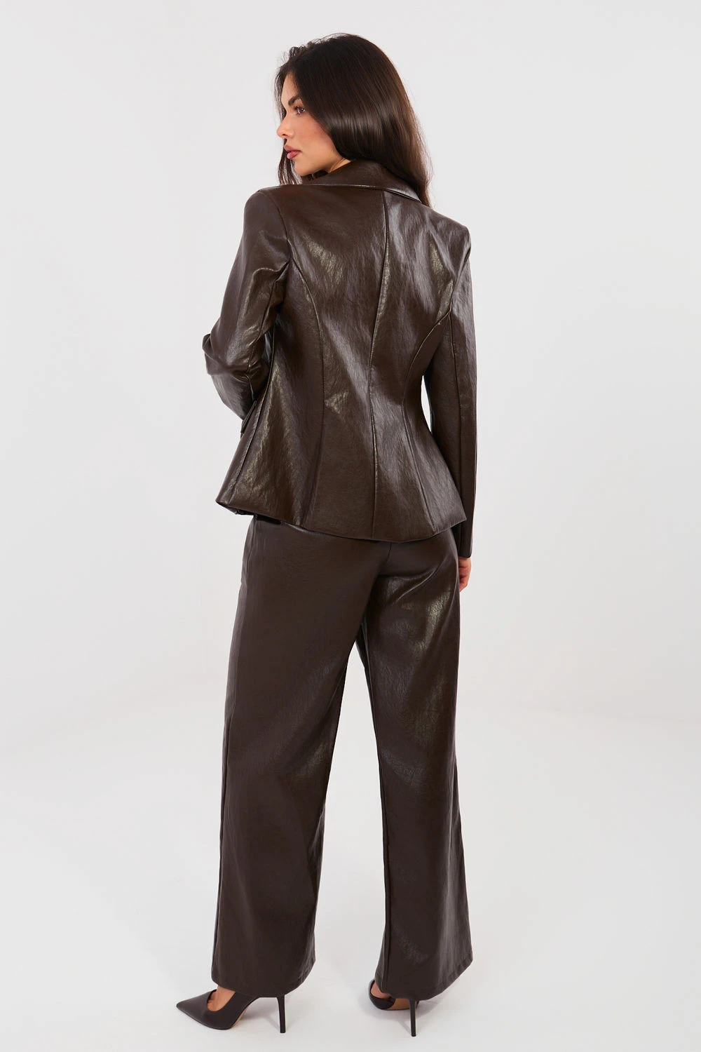 Elegantní dámské kalhoty z ekokože ve střihu wide leg jsou módní a univerzální volbou pro každodenní stylizace i do práce. Vyrobena z vysoce kvalitního materiálu, který kombinuje viskózu a polyuretan, spojuje efektní vzhled s pohodlím nošení. Model s hladkým vzorem a vysokým pasem krásně zdůrazňuje pas a opticky prodlužuje postavu. Široké nohavice dávají kalhotám moderní a uvolněný charakter a zajišťují pohodlí při nošení. Praktické boční kapsy zvyšují funkčnost modelu. Kalhoty jsou zapínány na zip a knoflík, což zaručuje dobré přizpůsobení a stabilitu. Ideální k kombinaci jak s elegantní blůzou a sako, tak i s volným svetrem nebo topem.