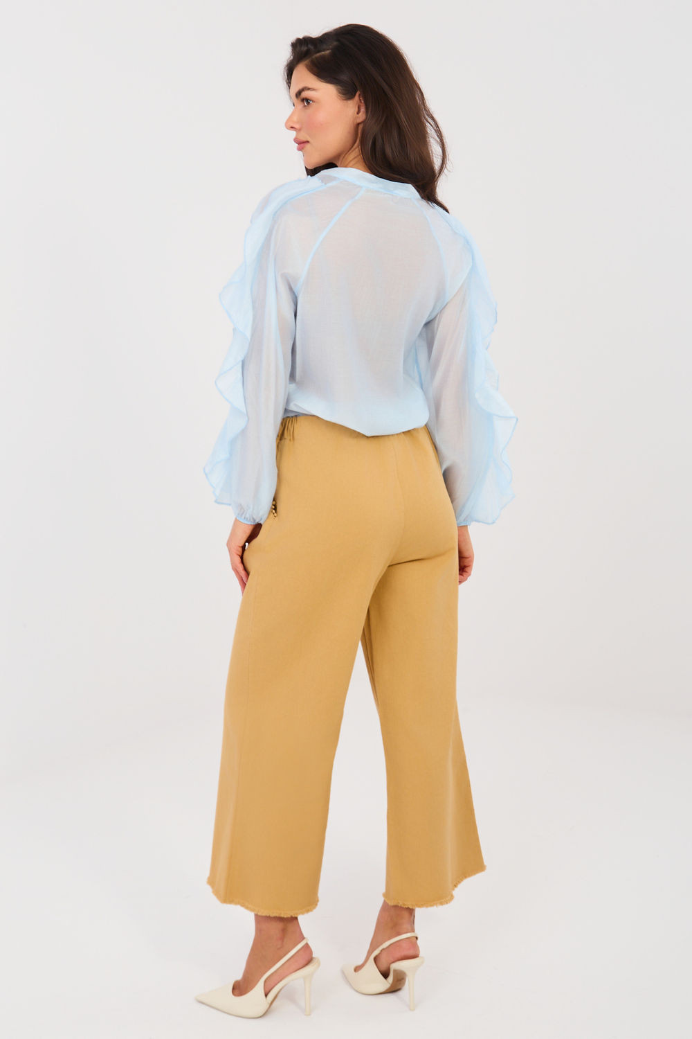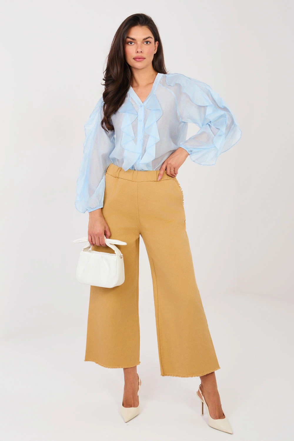 Dámské kalhoty s širokými nohavicemi ve stylu wide leg jsou pohodlným a stylovým návrhem na každý den i do práce. Vyrobené z vysoce kvalitní bavlny s přídavkem elastanu zajistí pohodlí nošení, elasticitu a dobrou střihovou přizpůsobivost. Model s hladkým vzorem a vysokým pasem krásně zdůrazňuje pas, a v pase je vsazena elastická guma pro pohodlí a volnost pohybu. Široké nohavice s efektním zakončením nařasením dodávají kalhotám moderní a trendy charakter. Kalhoty nemají zapínání, což dále zvyšuje komfort používání. Praktické boční kapsy zvyšují funkčnost modelu. Ideální pro každodenní stylizace s košilí, halenkou nebo svetrem.
