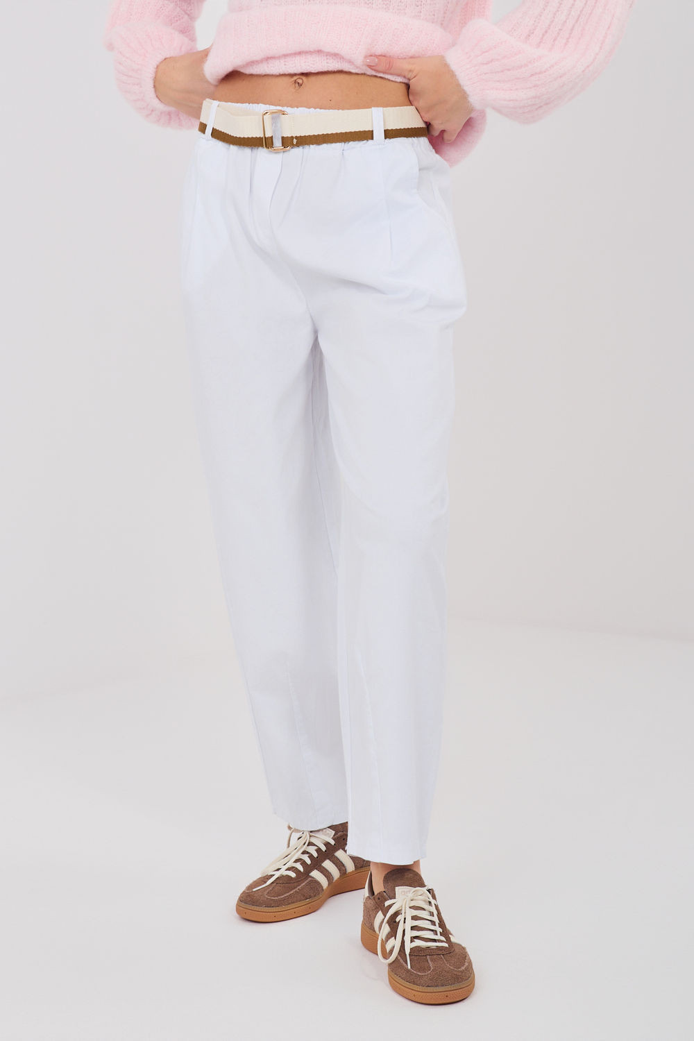Pohodlné a stylové kalhoty ve střihu mrkve, ideální pro každodenní, neformální stylizace. Vyrobené z vysoce kvalitní bavlny s přídavkem elastanu, co zajišťuje pohodlí a lehkost nošení a jemnou pružnost. Kalhoty mají vysoký pas a nohavice jsou zúžené a sahají do délky 7/8, co dodává moderní charakter. V pasu je vsazena guma a navíc jsou kalhoty vybaveny páskem s možností zapínání, co umožňuje ideální přizpůsobení. Praktické boční kapsy zvyšují funkčnost a hladký vzor umožňuje snadné kombinování s různými kousky šatníku. Tyto kalhoty jsou skvělou volbou pro ty, kteří ocení pohodlí, volnost pohybu a moderní neformální vzhled.