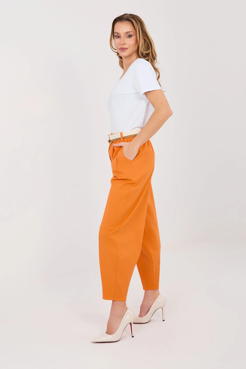 Pohodlné a stylové kalhoty v kroji mrkve, ideální pro každodenní, neformální stylizace. Vyrobené z vysoce kvalitní bavlny s přídavkem elastanu, co zaručuje pohodlí a lehkost nošení a jemnou pružnost. Kalhoty mají vysoký pas, nohavice jsou sešity a sahají po délce 7/8, co dodává moderní charakter. V pase je vsazena guma a navíc mají kalhoty pásek s možností zapínání, co umožňuje ideální přizpůsobení. Praktické boční kapsy zvyšují funkčnost a hladký vzor umožňuje snadno je kombinovat s různými kousky garderoby. Tyto kalhoty jsou skvělou volbou pro ty, kdo ocení pohodlí, volnost pohybu a moderní neformální vzhled.