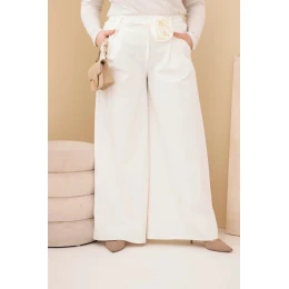 Dámské kalhoty Plus Size s širokou nohavicí a ozdobným květem v pase ecru