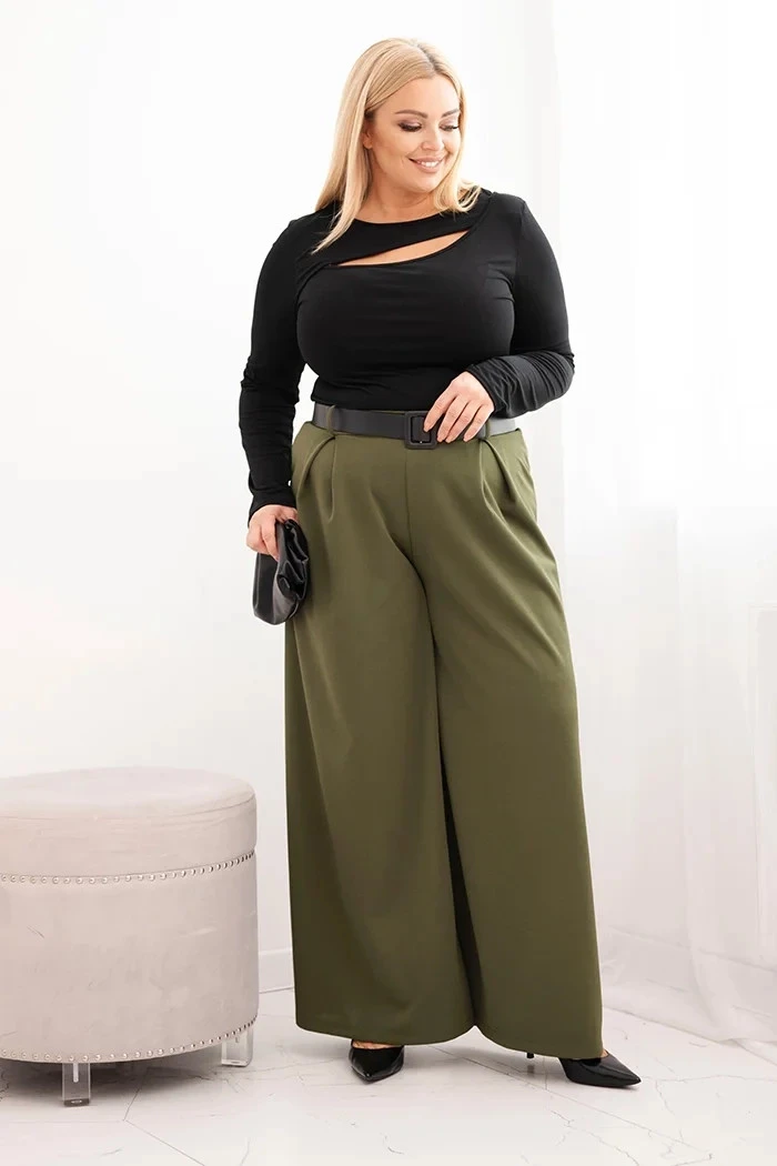 Dámské kalhoty Plus Size s širokou nohavicí a páskem khaki