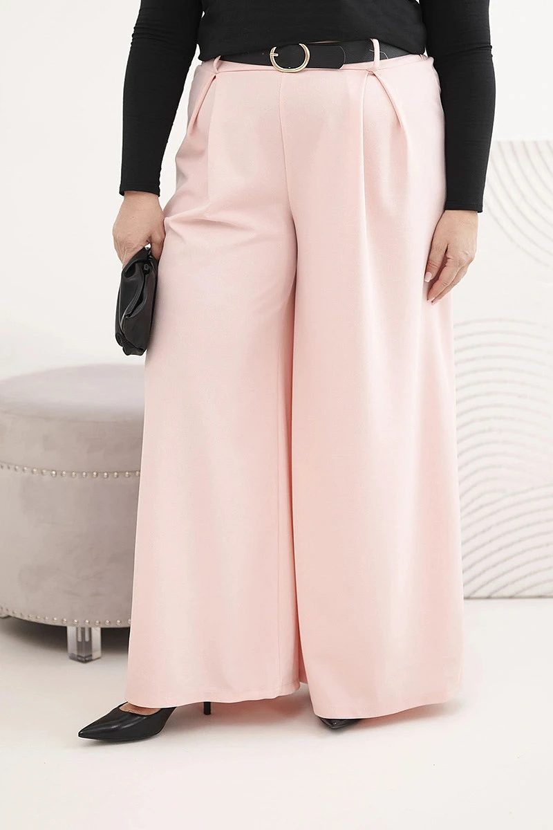 Dámské kalhoty Plus Size s širokou nohavicí a páskem pudrově růžové
