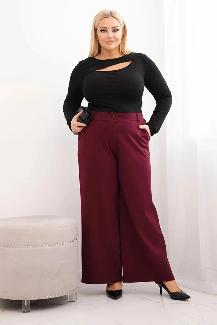 Tyto elegantní dámské kalhoty s širokými nohavicemi jsou vynikající volbou pro ženy, které ocení pohodlí a styl na každodenní nošení, do práce nebo na speciální příležitosti. Vyrobeny z měkkého materiálu s příměsí viskózy, zajišťují komfort nošení a volnost pohybu po celý den. Jejich klasický střih s elastickým pasem a knoflíkovým zapínáním zajišťuje dokonalé přizpůsobení postavě, zatímco široké nohavice dodávají lehkost a moderní vzhled.