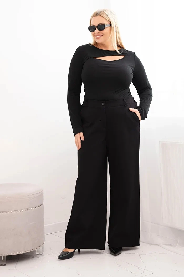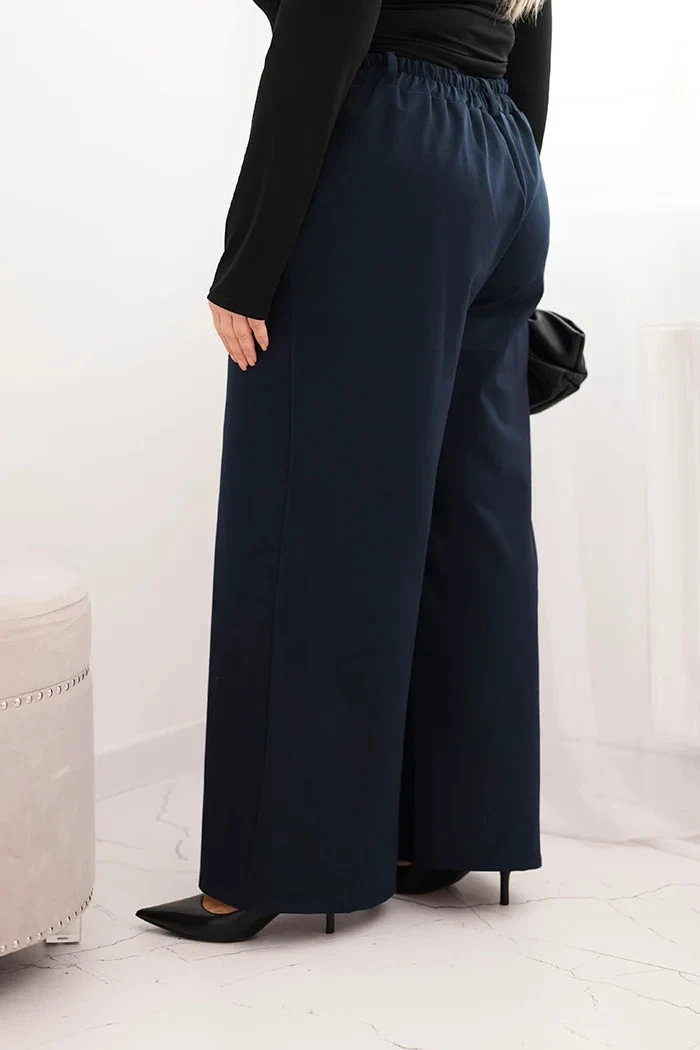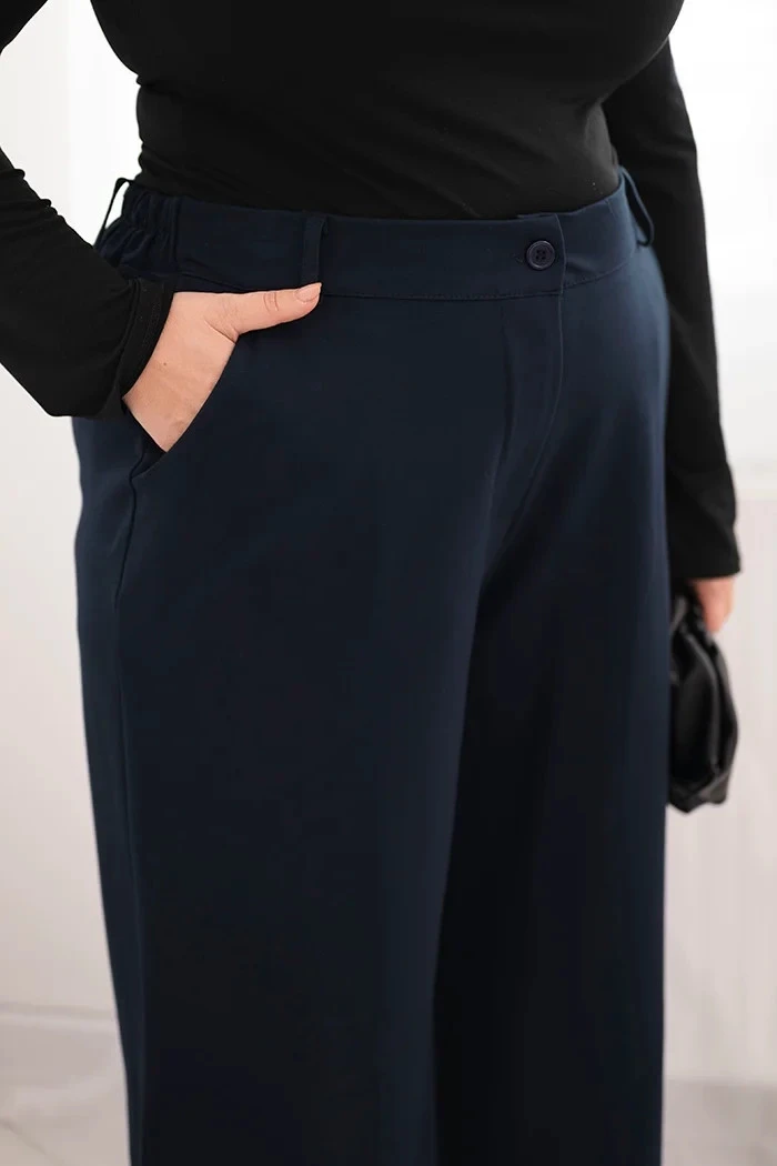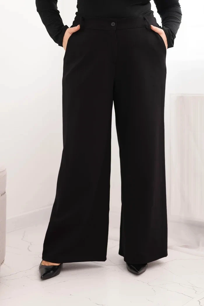Tyto elegantní dámské kalhoty s širokými nohavicemi jsou vynikající volbou pro ženy, které ocení pohodlí a styl na každodenní nošení, do práce nebo na speciální příležitosti. Vyrobeny z měkkého materiálu s příměsí viskózy, zajišťují komfort nošení a volnost pohybu po celý den. Jejich klasický střih s elastickým pasem a knoflíkovým zapínáním zajišťuje dokonalé přizpůsobení postavě, zatímco široké nohavice dodávají lehkost a moderní vzhled.