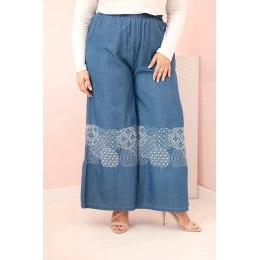 Dámské kalhoty Plus Size se širokými nohavicemi a etnickou výšivkou džínové