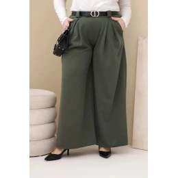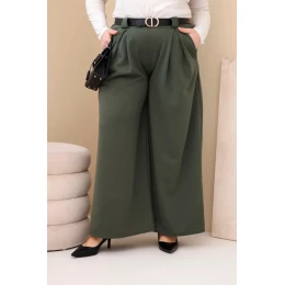 Dámské kalhoty Plus Size viskózové s širokou nohavicí a páskem khaki