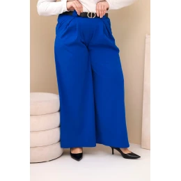 Dámské kalhoty Plus Size viskózové s širokými nohavicemi a páskem chabrové