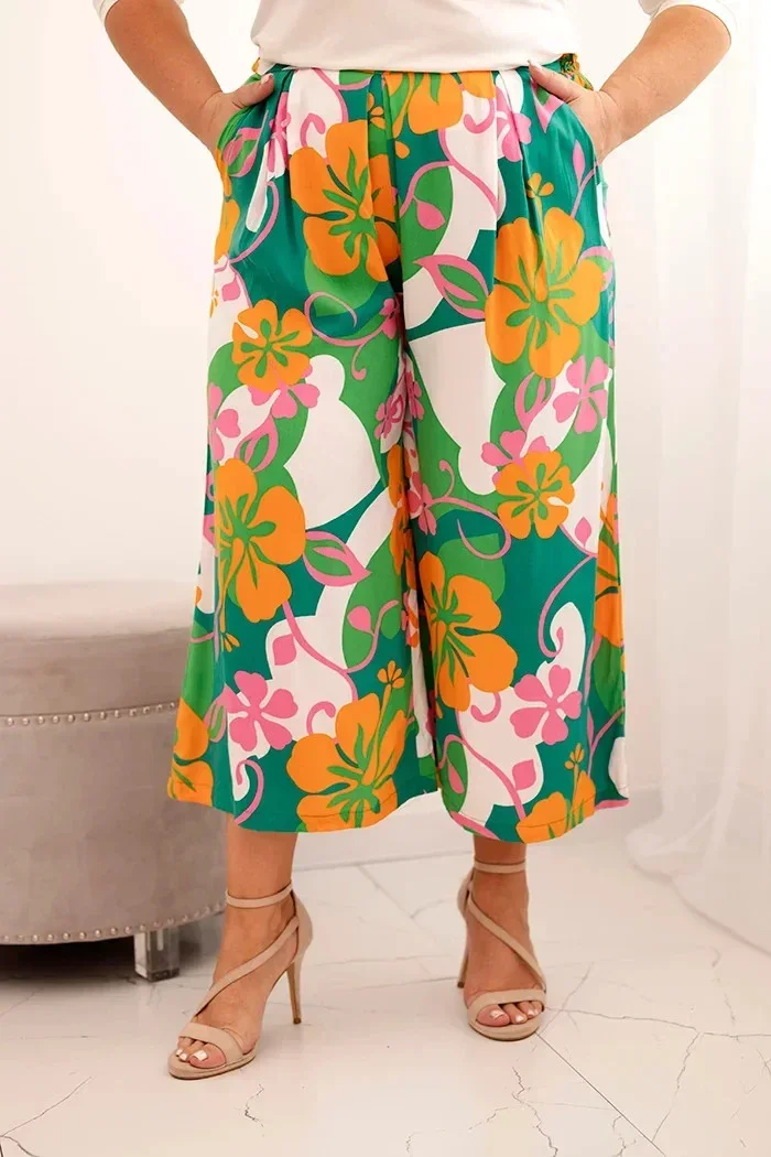 Dámské kalhoty Plus Size z viskózy s květinovým vzorem oranžová