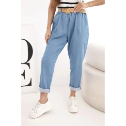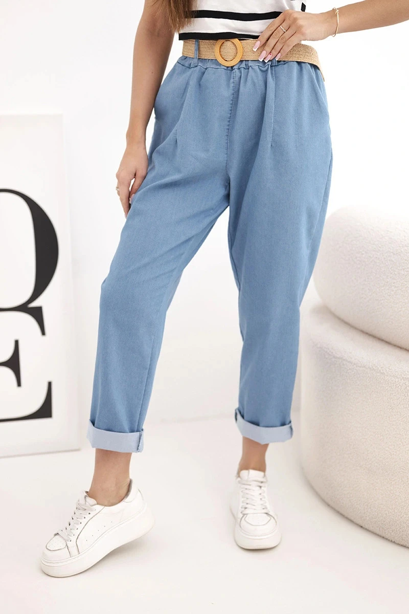 Dámské kalhoty s ohrnutou nohavicí a páskem světle džínové
