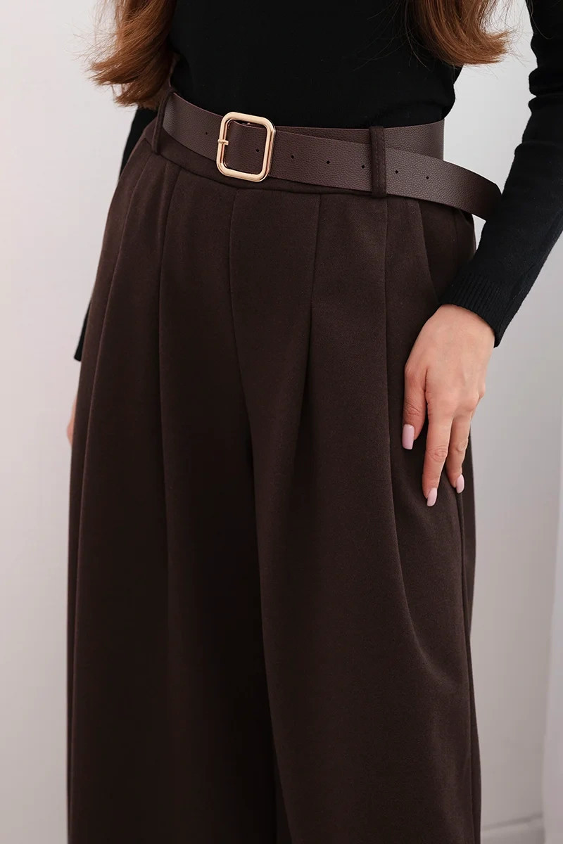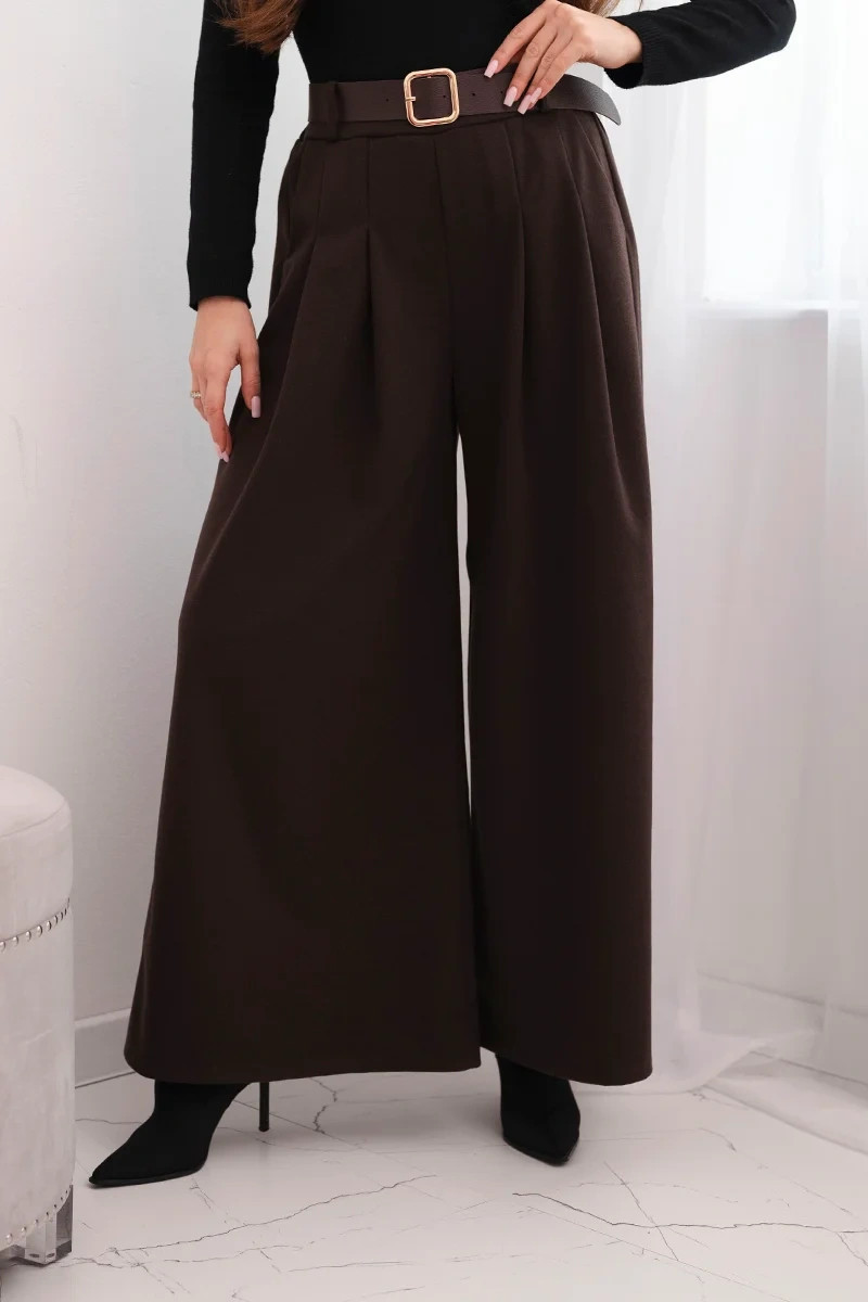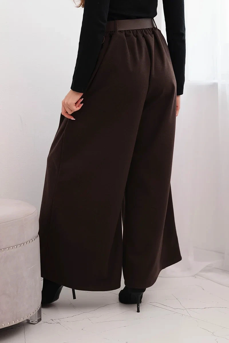 Dámské kalhoty s širokou nohavicí a páskem hnědé
