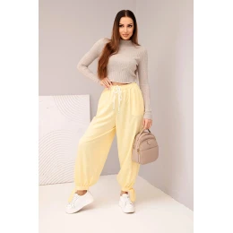 Dámské kalhoty s širokým model 21835105 a zavazováním dole žluté - K-Fashion