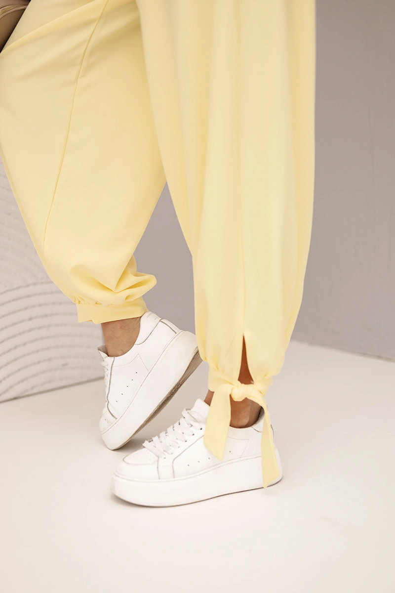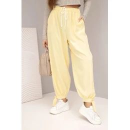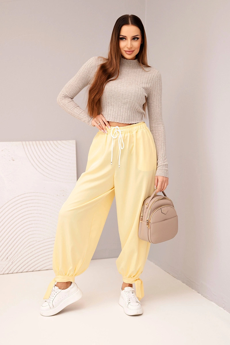 Dámské kalhoty s širokým nohavicím a zavazováním dole žluté