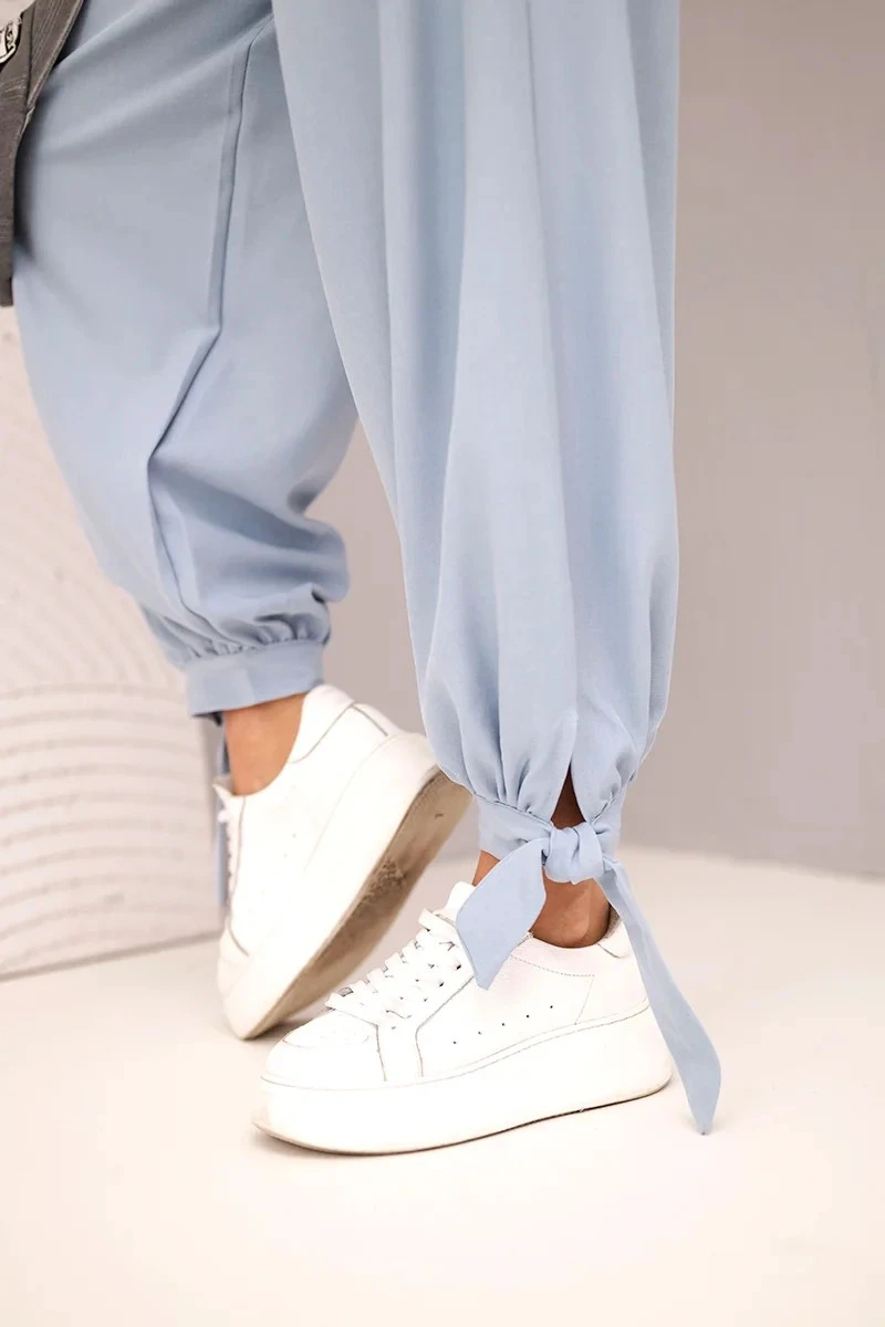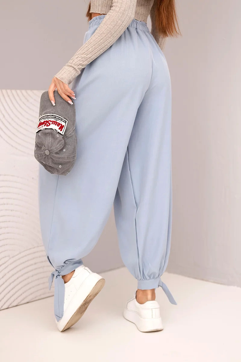 Dámské kalhoty s širokými nohavicemi a zavazováním dole džínové modré