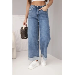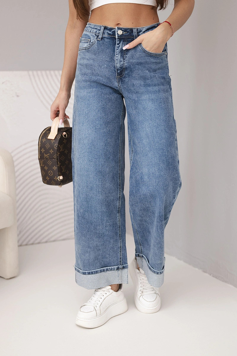 Dámské kalhoty s širokými nohavicemi a zdobeným spodním lemem džínové modré