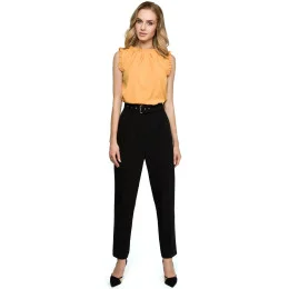 Klasické kalhoty na míru jsou nezbytnou součástí každého šatníku - kalhoty s vysokým pasem zdůrazňují pas, zatímco zúžené nohavice v délce ke kotníkům opticky prodlužují nohy. Opasek s kovovou sponou je dalším módním doplňkem. Kalhoty se zapínáním na zip a háček s kapsami na bocích.
