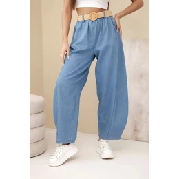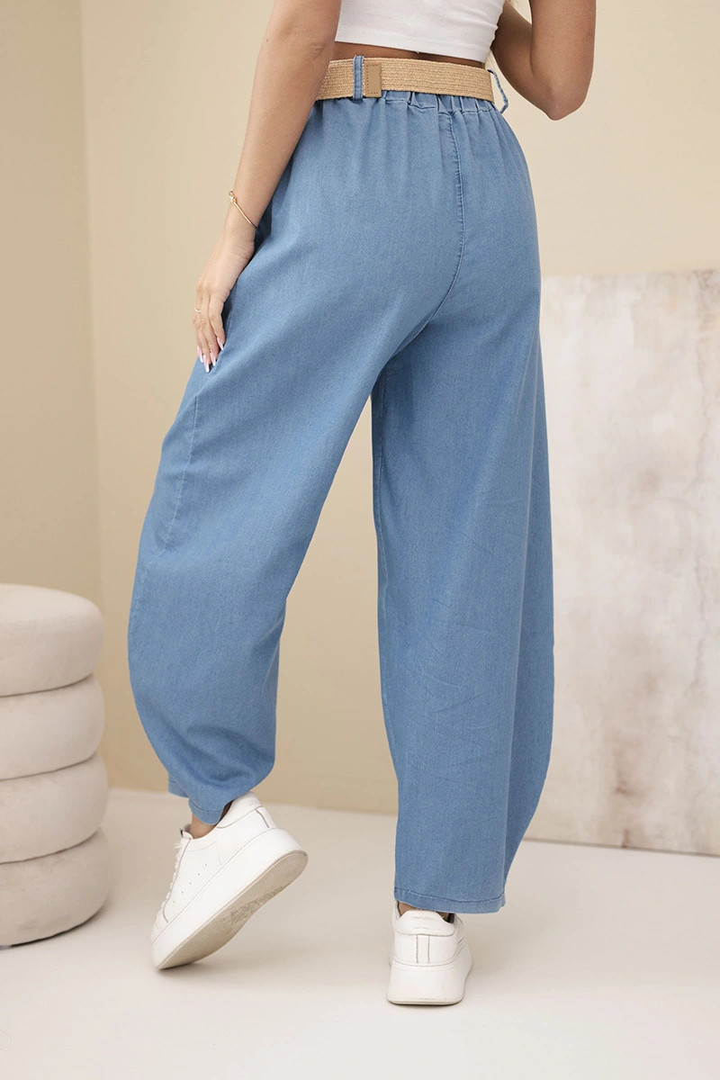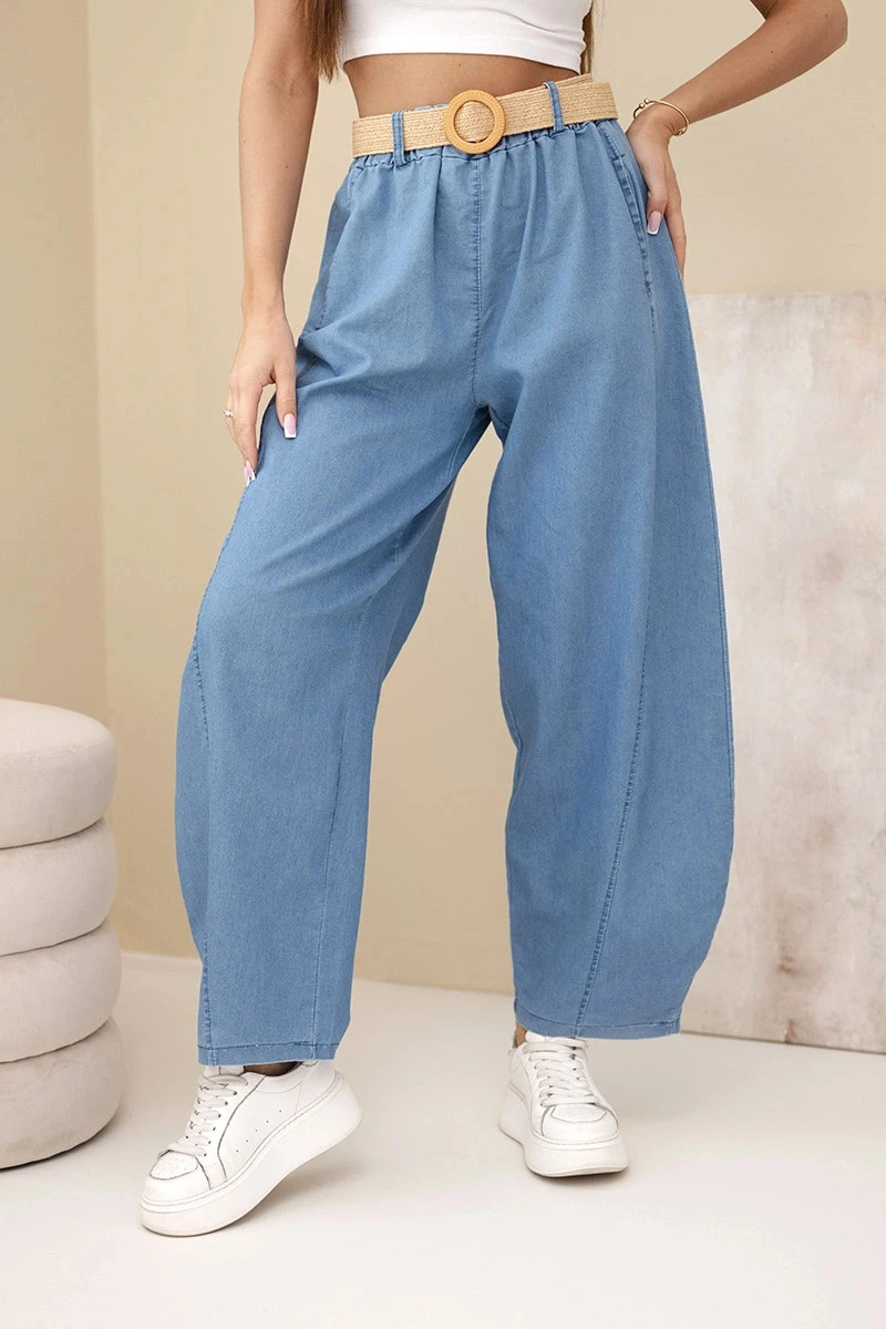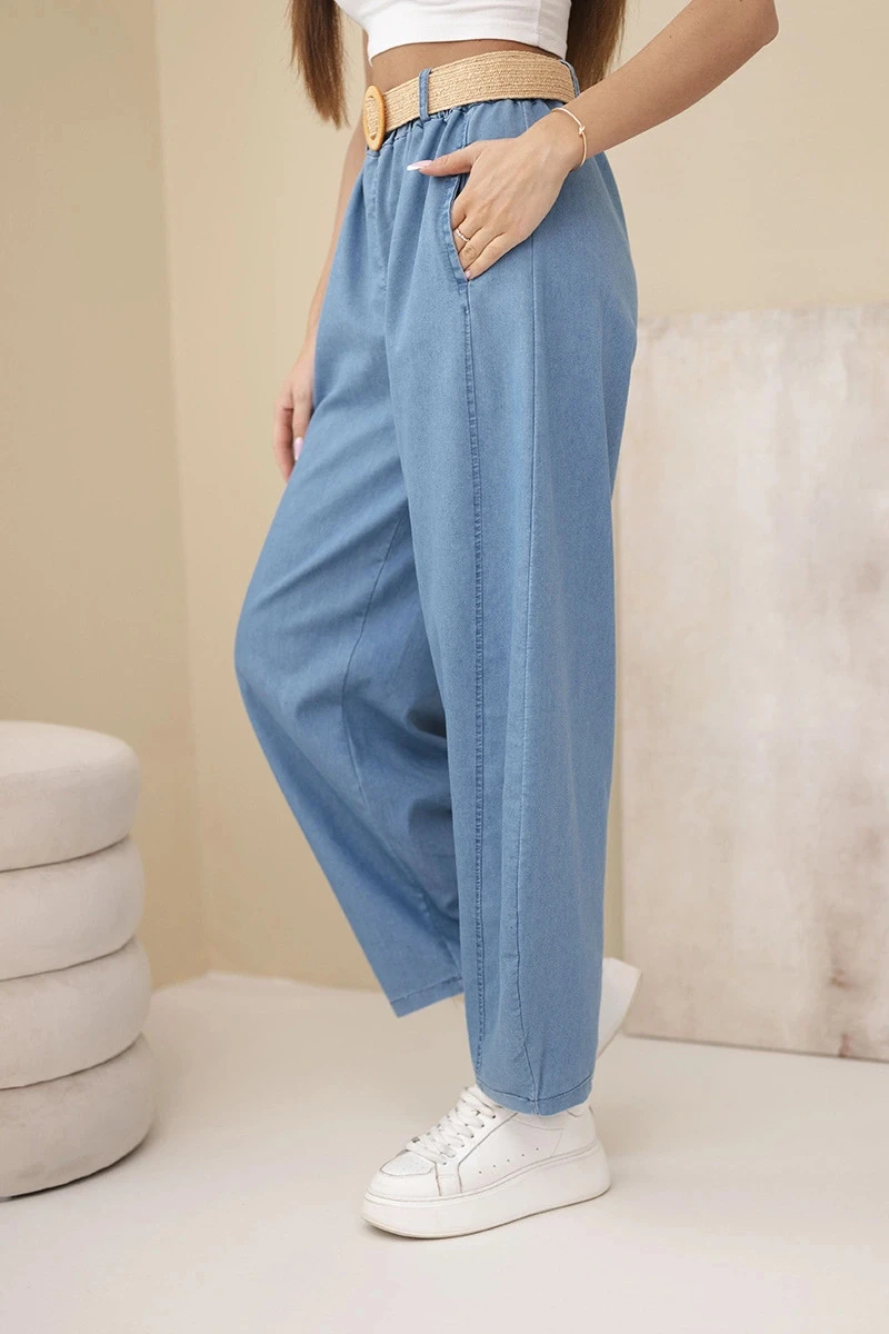 Dámské kalhoty se širokou nohavicí a páskem světle džínové