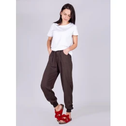 Dámské letní kalhoty v khaki barvě. Mají dvě praktické boční kapsy. Je vyrobena z jemné a lehké viskózy, která je ideální pro teplé dny. Díky stahovací šňůrce v pase si je můžete přizpůsobit svým individuálním potřebám a šňůrka má ozdobnou funkci. Spodní část nohavic zakončená širokými švy jim dodává ležérní vzhled.