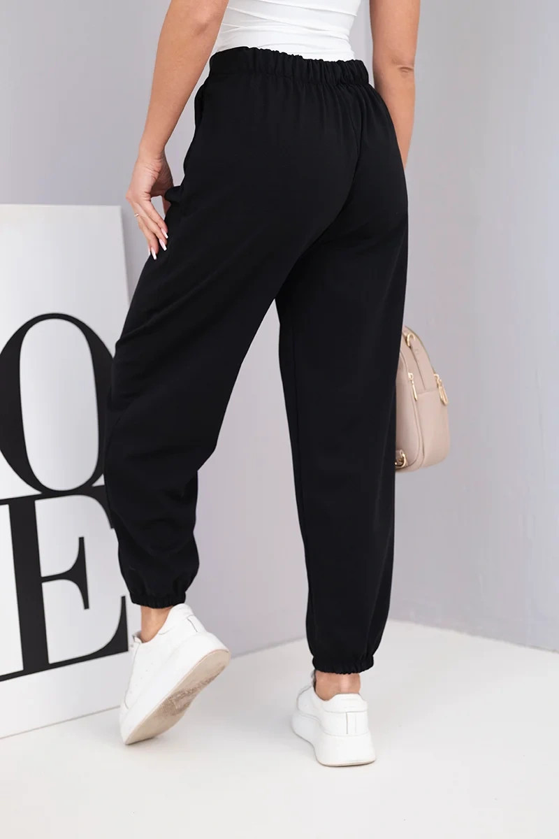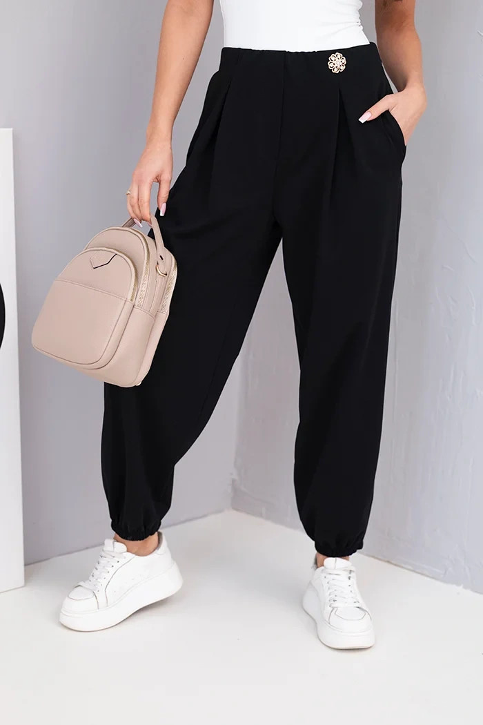Tyto elegantní dámské kalhoty s vysokým pasem jsou nabídkou pro ženy, které si cení spojení pohodlí a stylu. Volný střih s mírně zúženými nohavicemi zakončenými stahovacími manžetami dává kalhotám krásný tvar na postavě a hodí se k mnoha stylizacím – jak každodenním, tak i elegantnějším. Ozdobný knoflík vpředu jim dodává šarm a klasické zakončení. Skvěle se kombinují s blůzkami, topy nebo sako, čímž vytvářejí módní a ženský vzhled.
