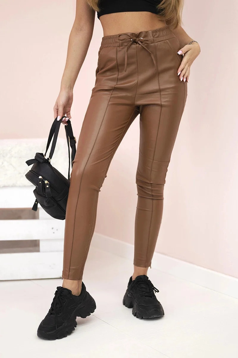 Dámské kalhoty z eko kůže s vázáním a rozparkem na model 21154127 hnědé - K-Fashion
