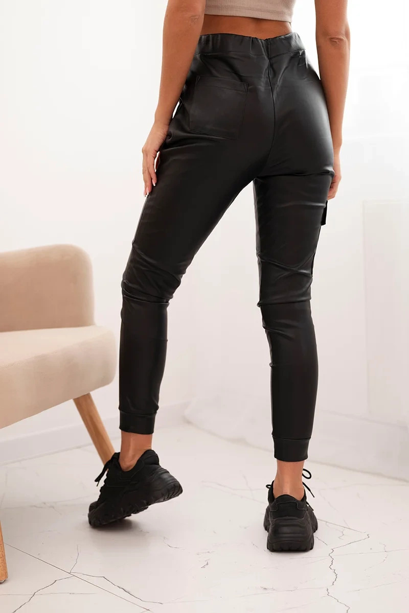 Dámské kalhoty z ekokůže s kapsami a vázáním v pase černé