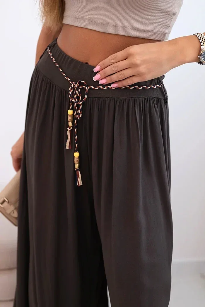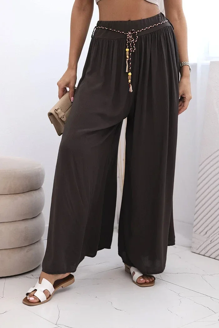 Tyto výjimečné dámské široké kalhoty z viskózy jsou skvělou volbou pro ženy, které si cení pohodlí a stylu. Ušité z lehké, prodyšné látky krásně sedí na postavě a zajišťují pohodlí po celý den. Široké nohavice jim dodávají módní, letní charakter a přiložený pletený pásek přidává originální kouzlo a zdůrazňuje pas.