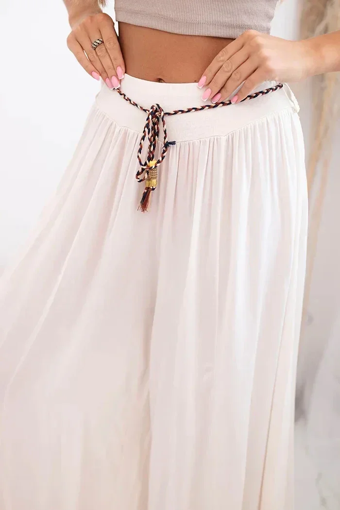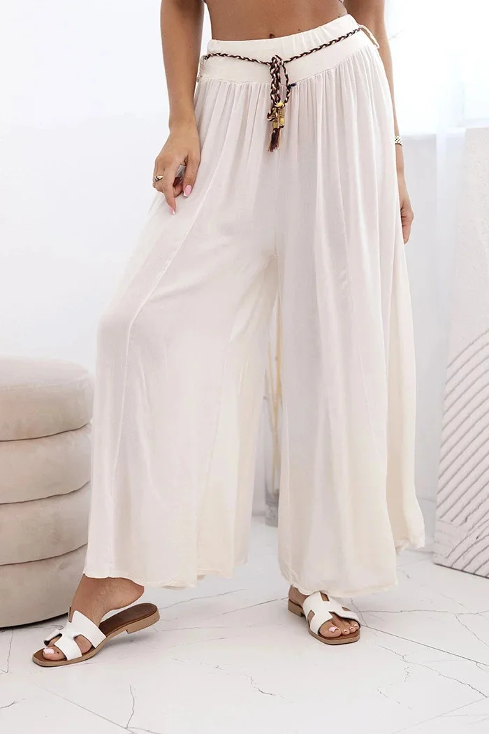 Tyto výjimečné dámské široké kalhoty z viskózy jsou skvělou volbou pro ženy, které si cení pohodlí a stylu. Ušité z lehké, prodyšné látky krásně sedí na postavě a zajišťují pohodlí po celý den. Široké nohavice jim dodávají módní, letní charakter a přiložený pletený pásek přidává originální kouzlo a zdůrazňuje pas.