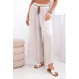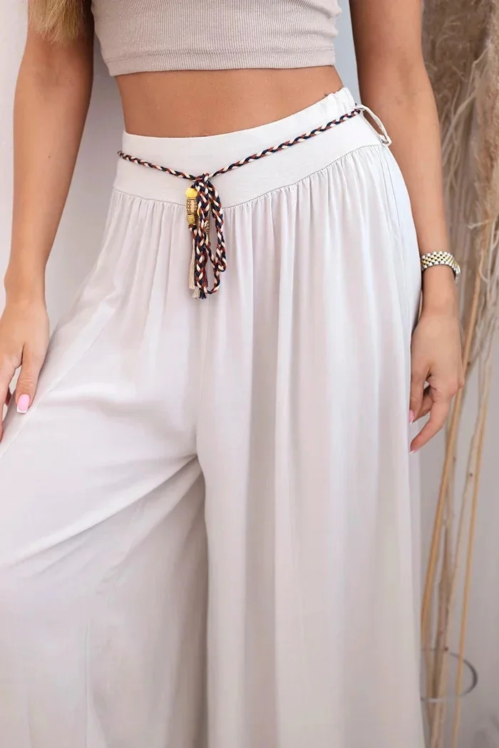 Tyto výjimečné dámské široké kalhoty z viskózy jsou skvělou volbou pro ženy, které si cení pohodlí a stylu. Ušité z lehké, prodyšné látky krásně sedí na postavě a zajišťují pohodlí po celý den. Široké nohavice jim dodávají módní, letní charakter a přiložený pletený pásek přidává originální kouzlo a zdůrazňuje pas.