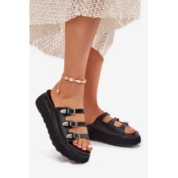 Dámské pantofle z eko kůže, usazené na platformě, jsou kombinací pohodlí a stylu. Model se vyznačuje třemi tenkými, nastavitelnými pásky s přezkami, které umožňují dokonalé přizpůsobení noze. Měkká stélka zajišťuje pohodlí po celý den a moderní design dělá z pantoflí ideální doplněk k letním stylizacím. Ideální na každodenní nošení, kombinují funkčnost s módním vzhledem. Při výběru velikosti se řiďte tabulkou velikostí.