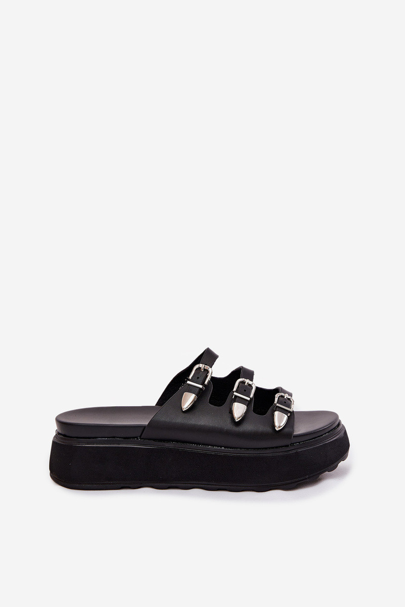 Dámské pantofle z eko kůže, usazené na platformě, jsou kombinací pohodlí a stylu. Model se vyznačuje třemi tenkými, nastavitelnými pásky s přezkami, které umožňují dokonalé přizpůsobení noze. Měkká stélka zajišťuje pohodlí po celý den a moderní design dělá z pantoflí ideální doplněk k letním stylizacím. Ideální na každodenní nošení, kombinují funkčnost s módním vzhledem. Při výběru velikosti se řiďte tabulkou velikostí.