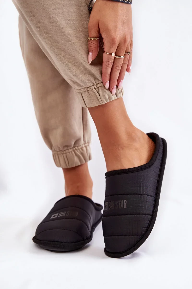 Dámské, nazouvací pantofle se širší špičkou zajistí pohodlí při používání. Pantofle z textilního materiálu s prošíváním. Nahoře je logo Big Star. Pantofle byly uvnitř zateplené měkkou dekou. Nasazeno na podrážce z pryžového materiálu, který dokonale izoluje od studené země. Při výběru velikosti použijte tabulku velikostí.